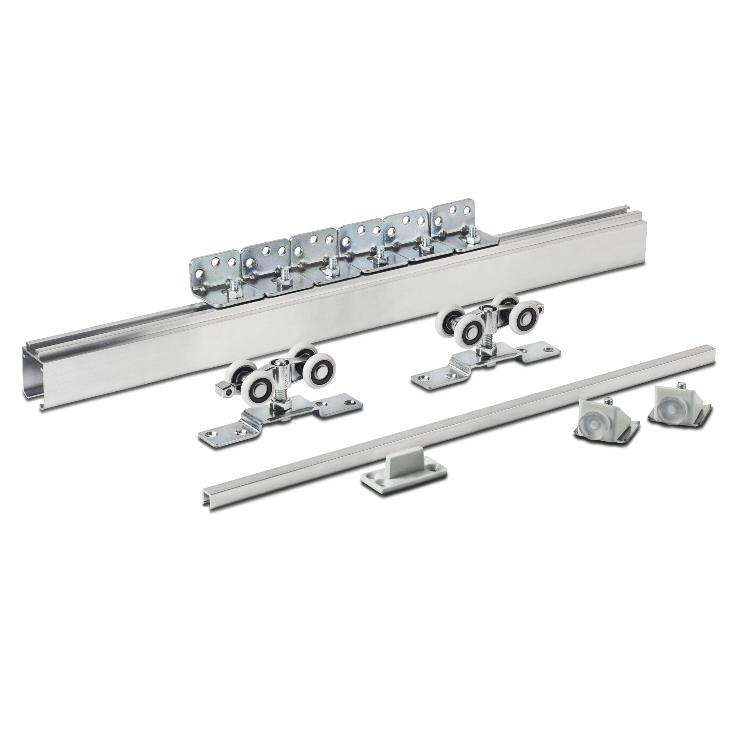 Розсувна система для міжкімнатних дверей Новатор 125 з металевими каретками Комплектація набору «Новатор 125» Верхній профіль – 1 шт., Нижній профіль – 1 шт., Металева роликова каретка з планкою – 2 шт., Стопор – 2 шт., Нижній Т-подібний напрямний елемент – 1 прим. Кріпильний куточок-6 шт. Підвісна розсувна система з металевими каретками для міжкімнатних дверей. Максимальна вага дверей – 125 кг. Довжина верхнього профілю – 2 м. Товщина дверного полотна – 16-50 мм. Перевага: - Безшумне закриття дверей; - Довговічність, за рахунок металевих кареток; Характеристики розсувної системи для міжкімнатних дверей: - Розсувна система верхнього спирання: верхній алюмінієвий профіль та ролики є несучими. - Верхній алюмінієвий профілі AL-95 та нижній AL-427 зроблені з неанодованого алюмінію «під срібло», стійкого до зношування. - Несучі, верхні каретки – з кульковими підшипниками. - Передбачено регулювання висоти дверей верхньою кареткою на 7мм. - Є інструкція з монтажу.