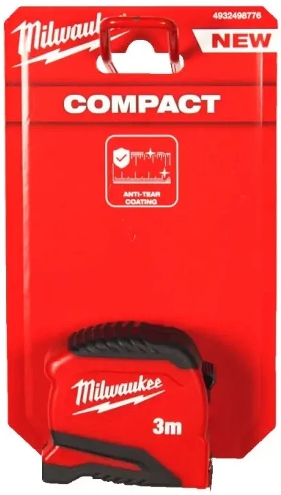 Рулетка Milwaukee Pro Compact 3 м × 19 мм (4932498776) — компактна професійна рулетка з автоматичним фіксатором змотування та лезом з покриттям для довговічності. Корпус із ударостійкого АБС-пластику з гумовими вставками витримує падіння з 2 м. Лезо шириною 19 мм з позначками на 1/8 та 1/16 дюйма, подвійна шкала (метрична та дюймова). Магнітний кінець точно фіксує на металі, вага 0.24 кг для зручного носіння. Висота рулетки 75 мм, ширина 60 мм, довжина 40 мм — поміщається в кишеню.