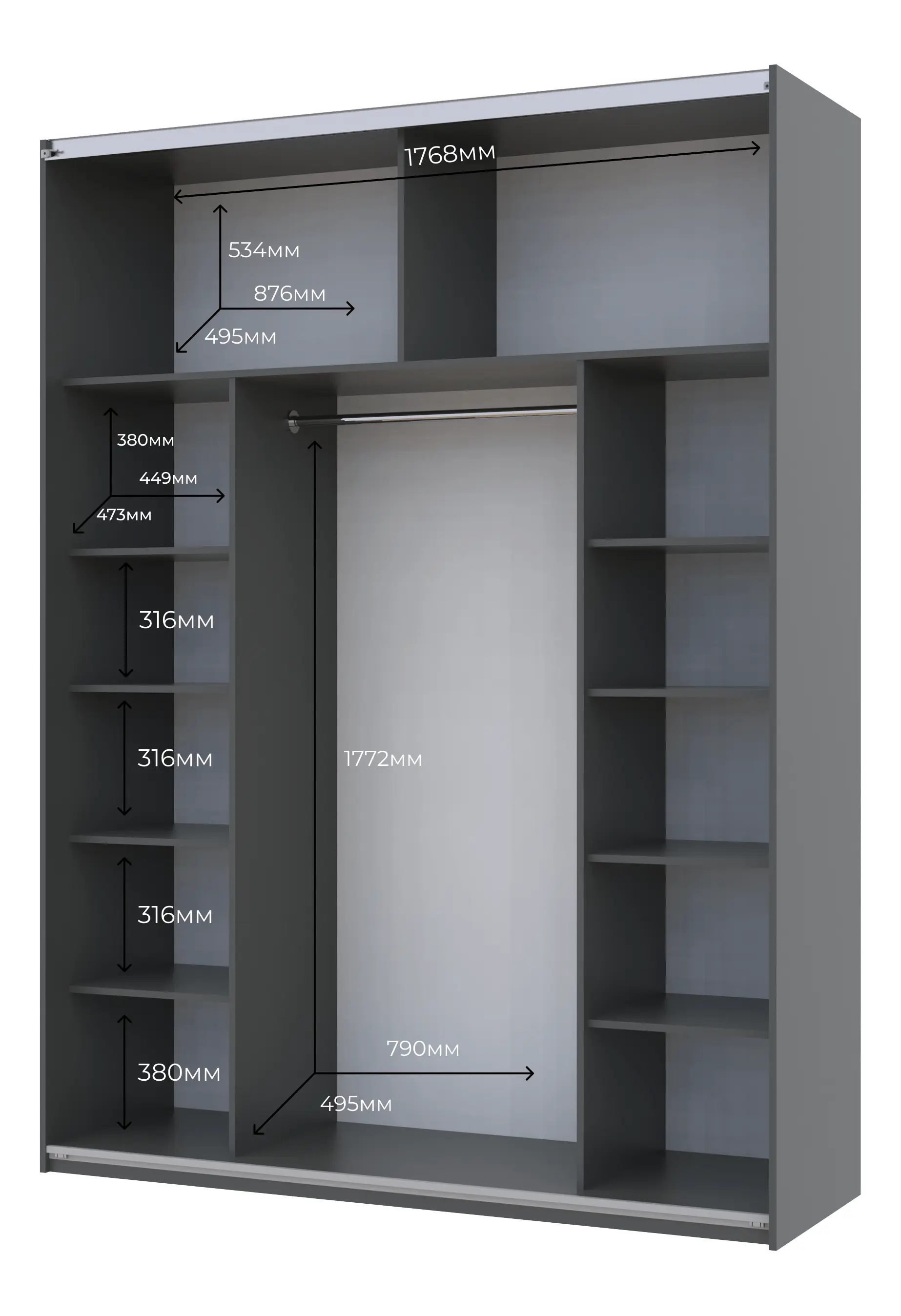 Шафа-купе двохдверна Doros G-Caiser — це ідеальне поєднання сучасного дизайну та практичності. Її елегантний графітовий колір легко впишеться в будь-який інтер'єр, додаючи йому нотки естетики та сучасності. Завдяки продуманій конструкції, ви зможете організувати простір вашої кімнати максимально ефективно, забезпечивши легкий доступ до всіх ваших речей.
