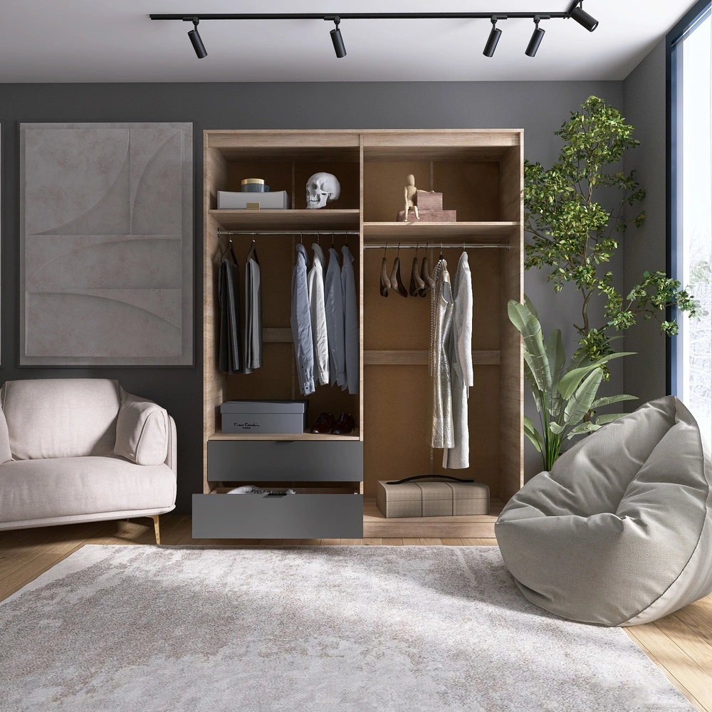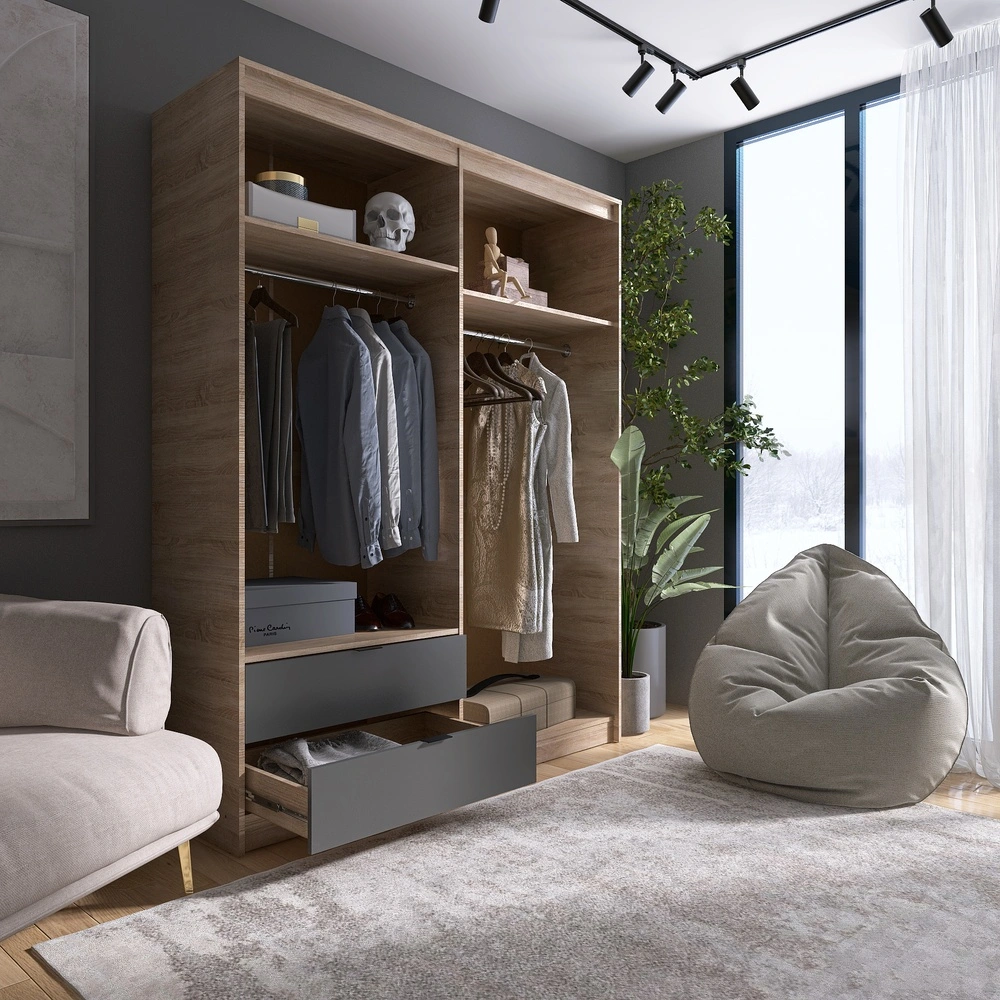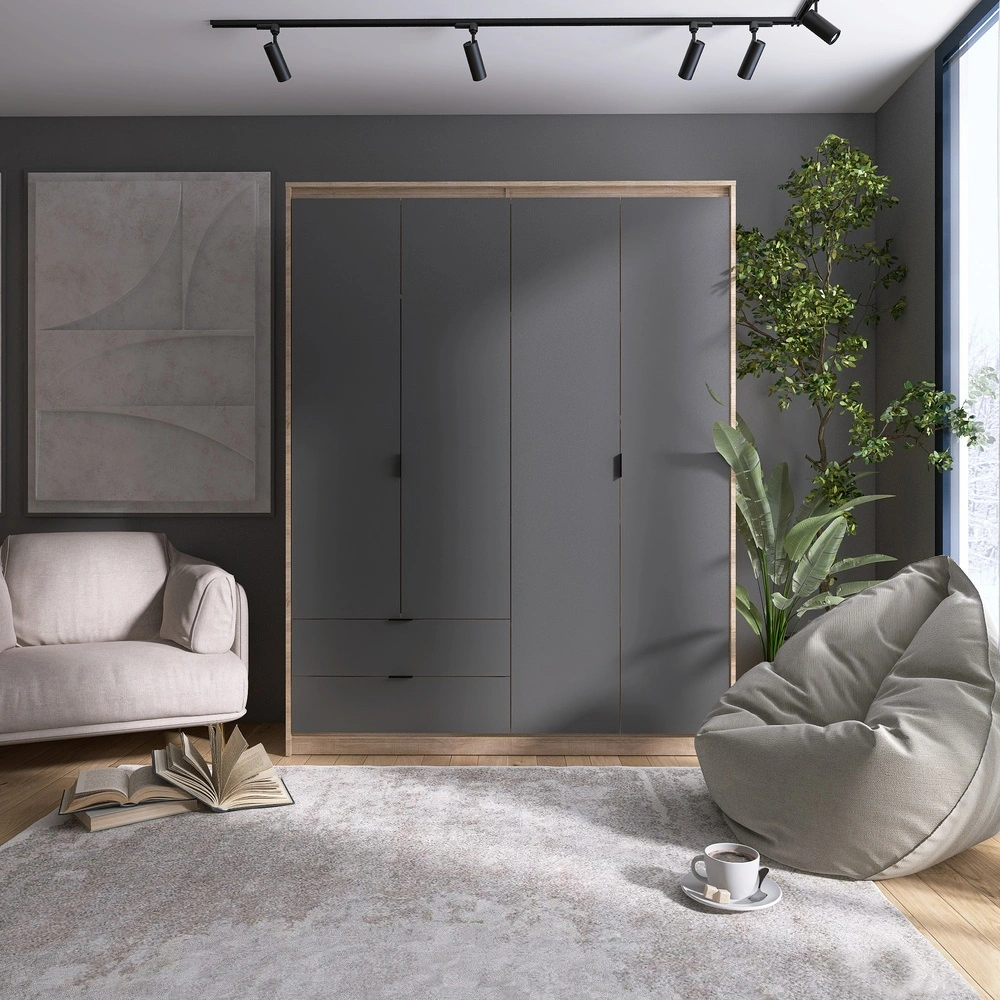Шафа розпашна для одягу Еверест Сіті-1600 - це ідеальне рішення для організації вашого простору. Завдяки своїм висувним шухлядам та штангам, вона забезпечує зручний доступ до вашого одягу та аксесуарів. Стильний дизайн у кольорах дуба сонома та графіту гармонійно впишеться в будь-який інтер'єр, додаючи йому сучасного вигляду.