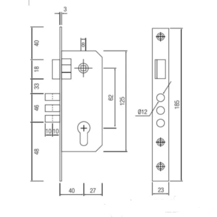 - Габарити лицьової частини замка 23х185 мм
