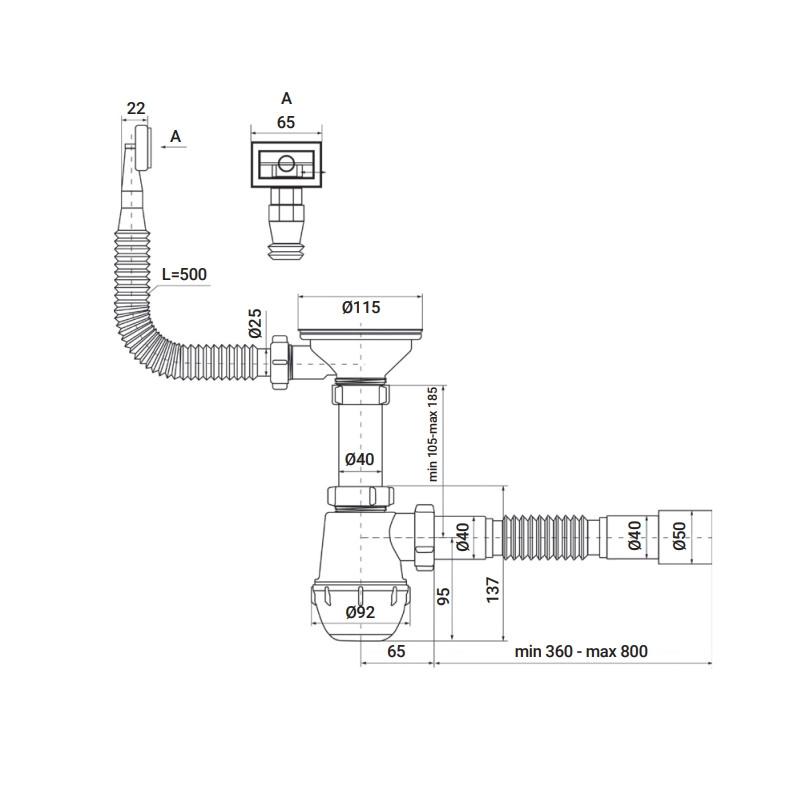 - Комплектація Сифон, гнучка труба 40х40/50 для підключення до ка