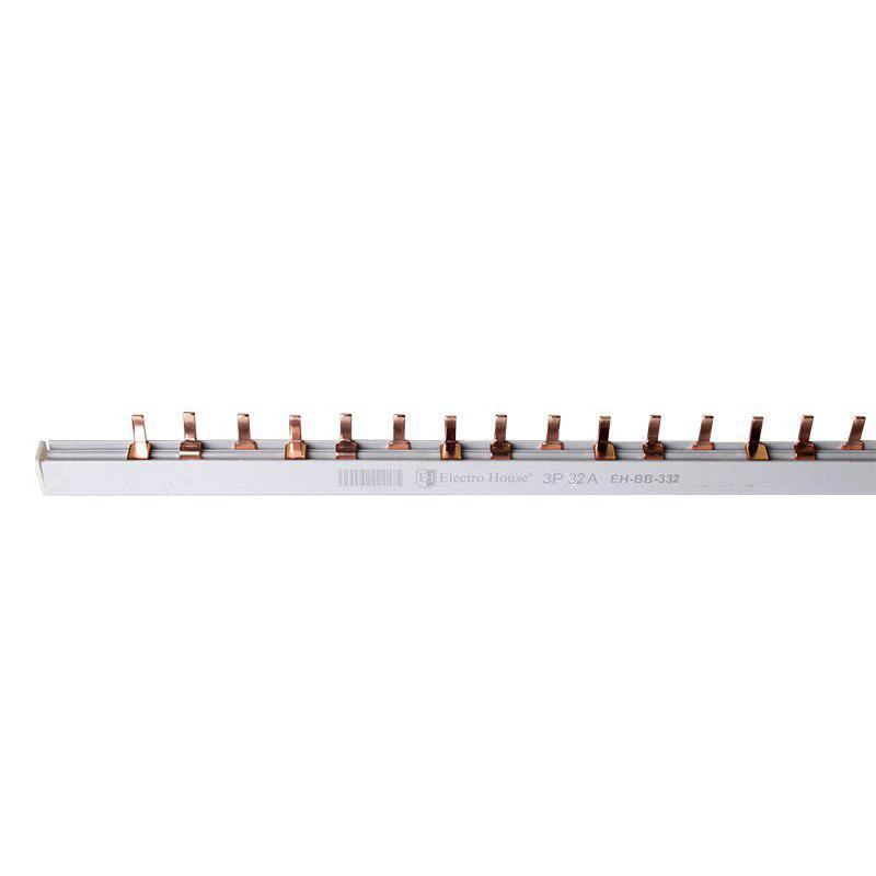 Шина з'єднувальна (гребінка) 3P 32A, 54 модулі, 1 м EH-BB-332 від ElectroSpace – це сучасне рішення для підключення автоматичних вимикачів, ПЗВ, дифавтоматів та інших захисних пристроїв. Її основне призначення – забезпечення паралельного підключення пристроїв за допомогою подання напруги певних фаз або полюсів, замінюючи застарілі способи з’єднання через саморобні перемички.
