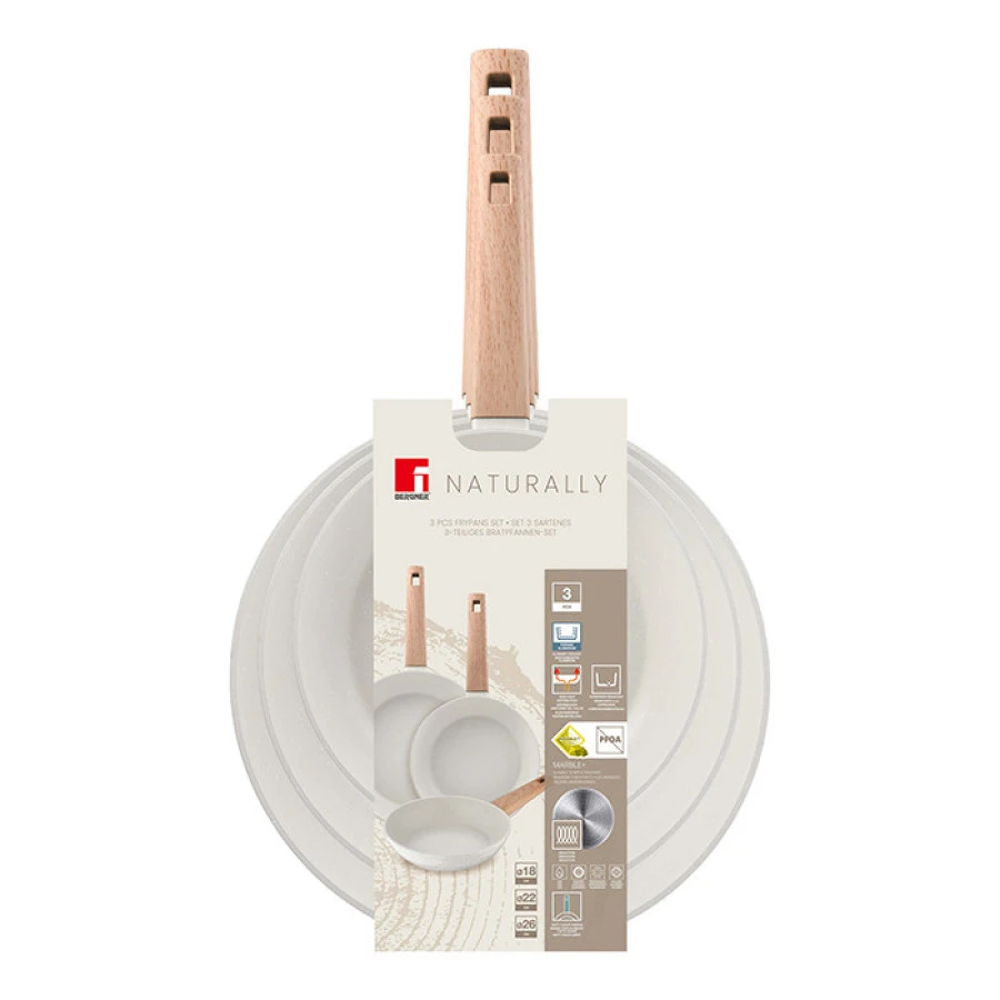 Серія Naturally пропонує вам сковороду діаметром 24 см, яка оптимально зберігає тепло для повільного і дбайливого приготування їжі завдяки високоякісному литому алюмінію, з якого вона виготовлена. Практична сковорода з двома носиками з боків для наливання кремів і рідин без проливання. Ергономічна дерев'яна ручка soft-touch забезпечує надійний захват. Насолоджуйтесь колекцією з індукційним дном, що підходить для всіх варильних панелей на ринку, а також її кремовим кольором з тонкими золотими і білими крапками, які додадуть теплоти вашій кухні. Легко чиститься, рекомендується мити вручну, щоб продовжити термін служби виробу.