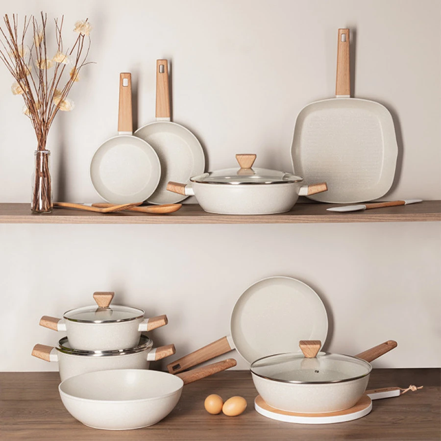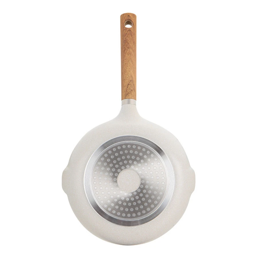 Пропонуємо вашій увазі 28-сантиметрову сковорідку, яка завдяки високоякісному литому алюмінію оптимально зберігає тепло для повільного та дбайливого приготування їжі. Практична сковорідка з двома носиками з боків для наливання кремів або рідин, які не розливаються. Безпечно тримайте її за ергономічну дерев'яну ручку з м'яким покриттям, що забезпечує ідеальний захват. Насолоджуйтеся колекцією, розробленою з точковою індукційною основою, що підходить для всіх варильних поверхонь на ринку, а також її кремовим кольором з тонкими золотистими та білими крапками, що додасть вашій кухні теплоти та затишку. Легко миється, для подовження терміну служби рекомендується ручне миття.