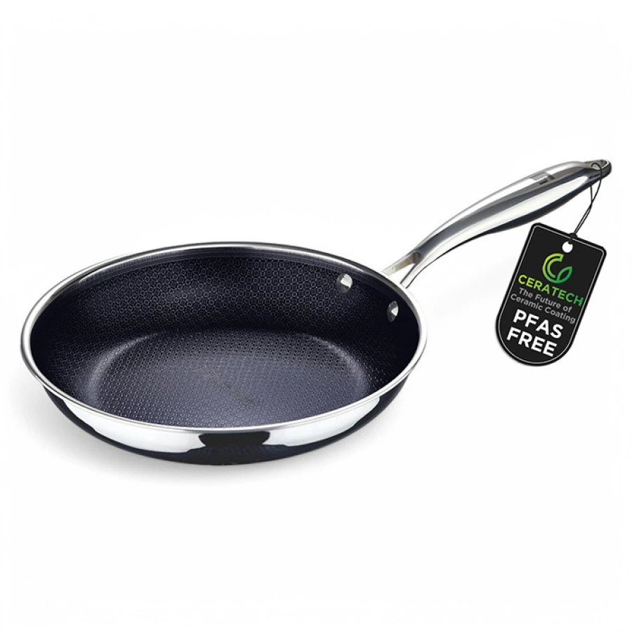 Точність, довговічність і стиль на вашій кухні! 20-сантиметрова сковорода поєднує в собі високоефективне потрійне покриття з алюмінію та нержавіючої сталі, що забезпечує рівномірний розподіл тепла та бездоганне приготування їжі при кожному використанні. 20-сантиметрова сковорода має надміцне антипригарне покриття CERATECH, яке зливається з протравленою основою з нержавіючої сталі, що ідеально підходить для підрум'янювання, підсмажування та покращення смаку ваших страв без особливих зусиль, а завдяки ручці з приємним на дотик покриттям ви можете забудьте про несподівані опіки та готувати у повній безпеці. Крім того, витончений дизайн з нержавіючої сталі додає сучасності будь-якій кухні. Сумісна з усіма типами плит (індукційними, галогенними, електричними, газовими та інфрачервоними) і забезпечує найкращу продуктивність на кожній з них. Для продовження терміну служби рекомендується ручне миття. Технологія, стиль і функціональність - все в одній каструлі.
