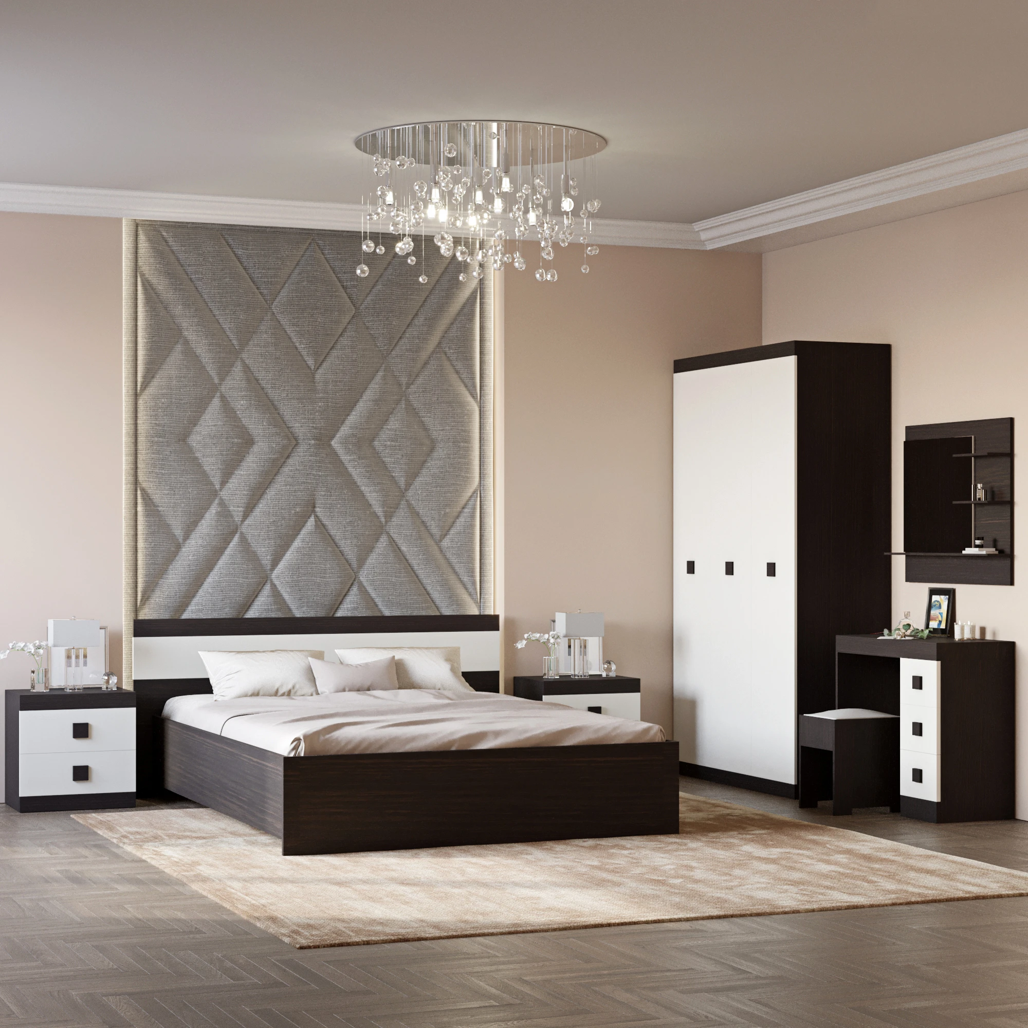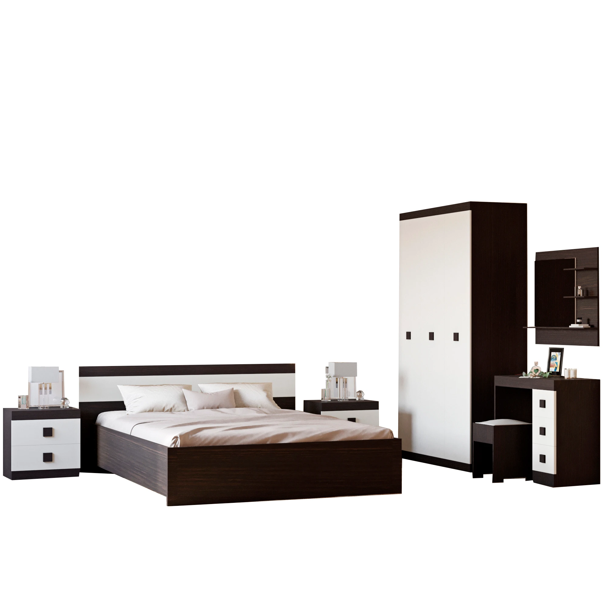 - Комплектація З двома тумбами, З трюмо, З пуфом, З шафою