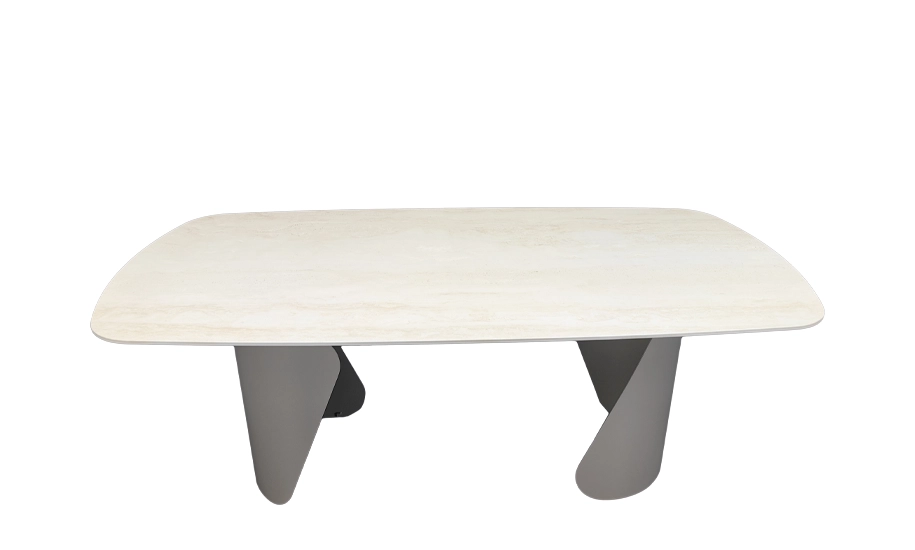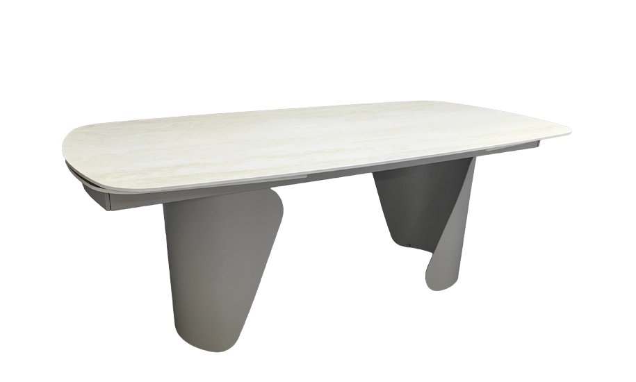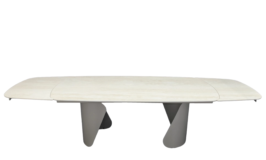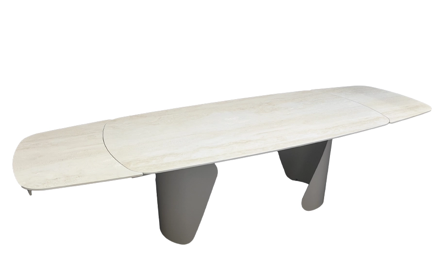 Стіл Опера у відтінку травертин відзначається елегантною матовою стільницею з кераміки, яка імітує натуральний камінь та зберігає стійкість до подряпин і вологи. Конструкція доповнена масивними металевими ніжками у кольорі тауп, що створюють сучасний акцент у просторі. Завдяки розкладному механізму довжина столу змінюється з 200 до 300 см, забезпечуючи комфортне розміщення великої кількості гостей.