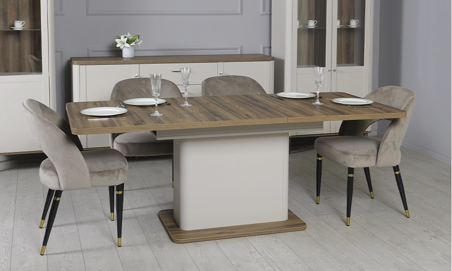 Завдяки поєднанню натуральних відтінків і сучасних матеріалів цей обідній стіл стане стильним доповненням вашого інтер’єру та забезпечить комфортні умови для сімейних вечерь та святкових зустрічей.