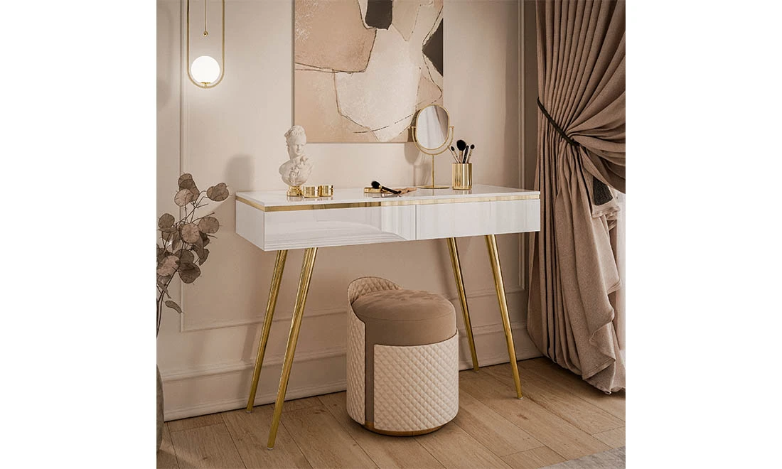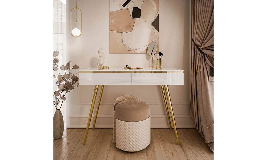 Стіл туалетний Моніка – елегантний вибір для сучасного інтер’єру. Виконаний у білому глянцевому кольорі з витонченими золотими ніжками, він додає простору стильного вигляду та функціональності.