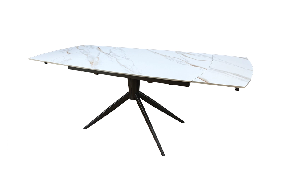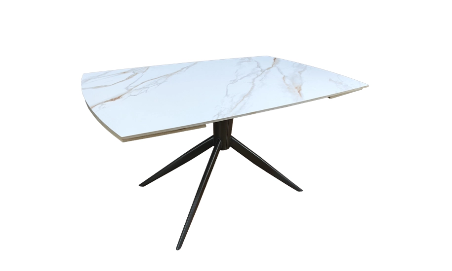 Стіл Віраж вирізняється глянцевою керамічною стільницею у молочному відтінку з легким мармуровим візерунком і металевими ніжками кольору темного графіту.