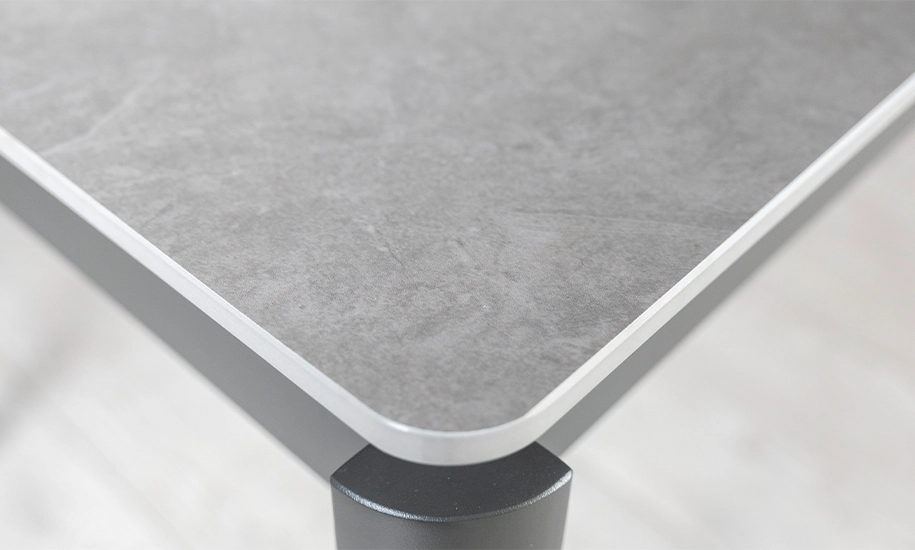 Сіра матова стільниця виглядає стильно та стримано, а металеві ніжки кольору графіт додають конструкції стійкості та індустріального шарму.
