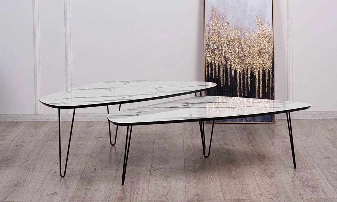 Стильний журнальний столик, який створений дарувати естетичну насолоду. Приваблива форма стільниці кольору білого мармуру неперевершено поєднується з металевим каркасом чорного кольору. Цей легкий, функціональний та практичний стіл гармонічно доповнює будь-який тип інтер’єру. Особливої неповторності йому додають витончені ніжки, які привертають увагу своєю незвичною формою. Конструкція надзвичайно стійка та зручна у використанні.