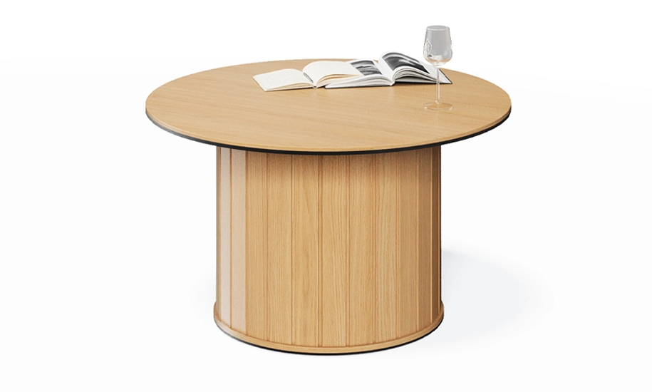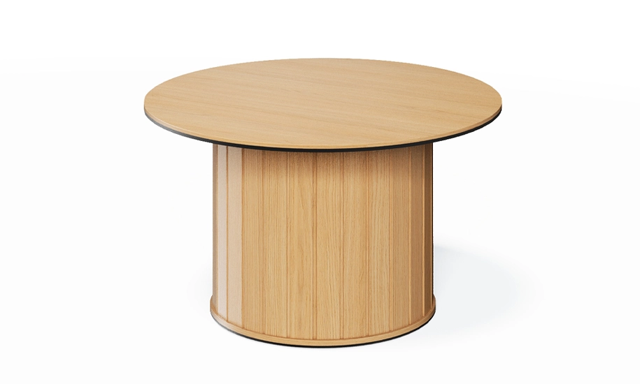 - Центральна опора з рифленими панелями додає візуального ритму та глибини формі. Така конструкція не лише естетично приваблива, а й практична: пил не накопичується під столом, а поверхню легко утримувати в чистоті. Опора покрита зносостійким ПВХ - матеріалом, що не деформується й не потребує складного догляду. Уся поверхня столу гладенька, приємна на дотик і швидко очищується - комфорт для тих, хто цінує простоту в побуті.