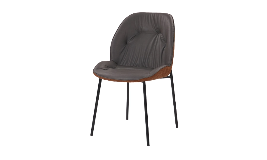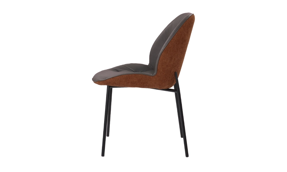 - Сидіння з м’якого ПУ забезпечує комфорт і простоту догляду, а спинка з тканинною оббивкою теплого рудого кольору додає відчуття затишку.