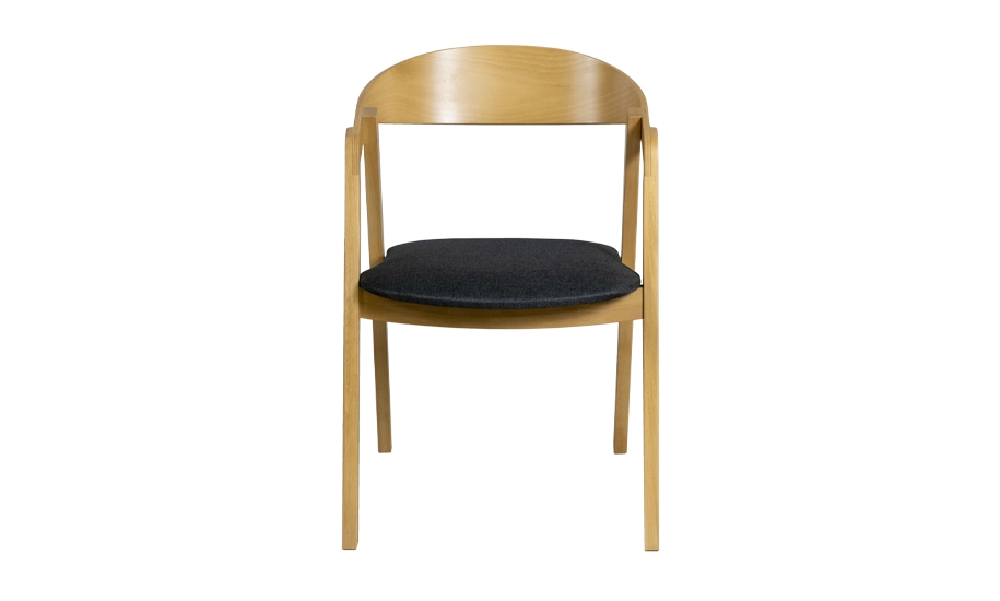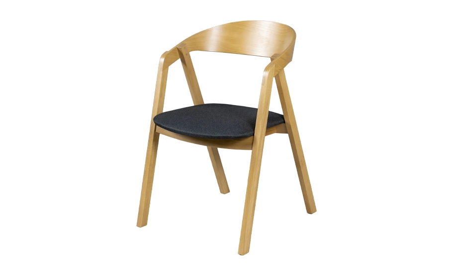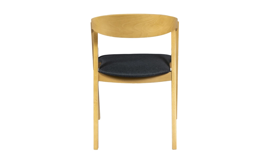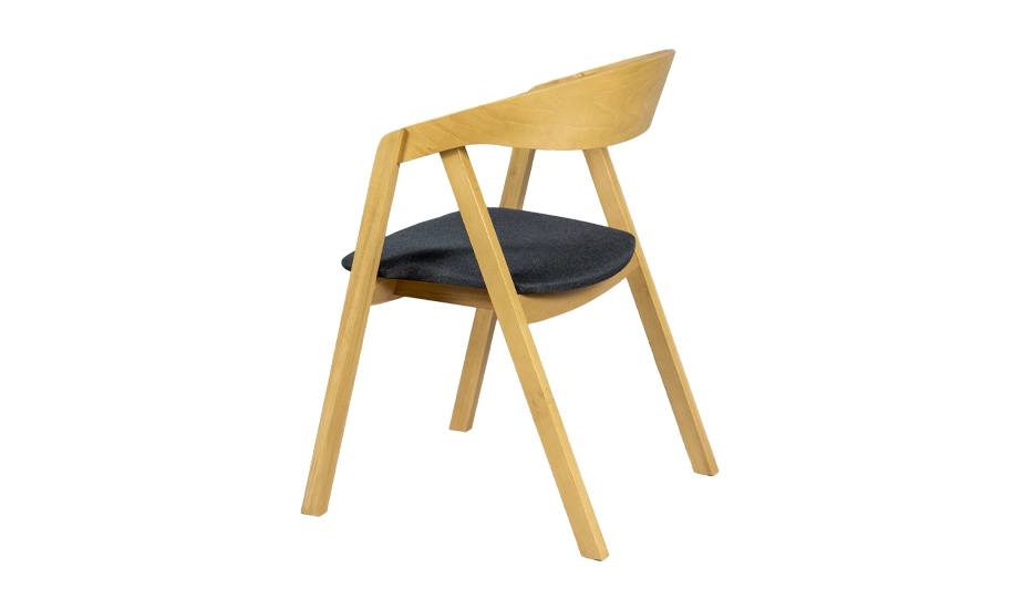 - Спинка виготовлена з гнутоклеєної деревини (ГКД) зі шпонованим буком, має анатомічно вигнуту форму, яка дарує комфорт навіть під час тривалого сидіння. Цей конструктивний елемент додає стільцю не тільки візуальної легкості, але й функціонального комфорту.