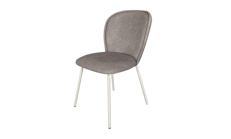 Стілець Сімпл поєднує лаконічні форми та світло-сіру тканинну оббивку, що створює відчуття затишку й легкості. Білі металеві ніжки з матовим покриттям підсилюють відчуття легкості та гармонійно вписуються в сучасний простір.