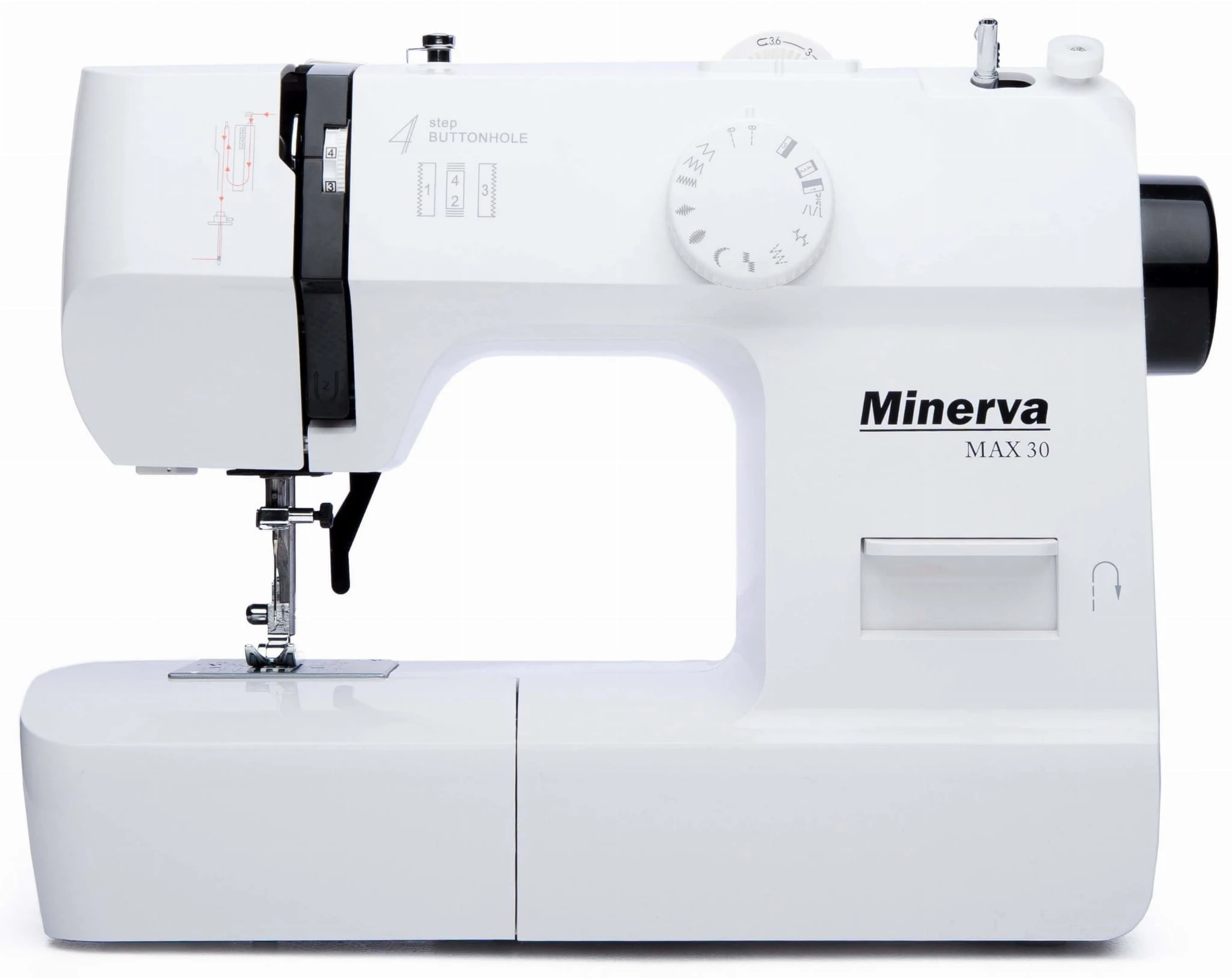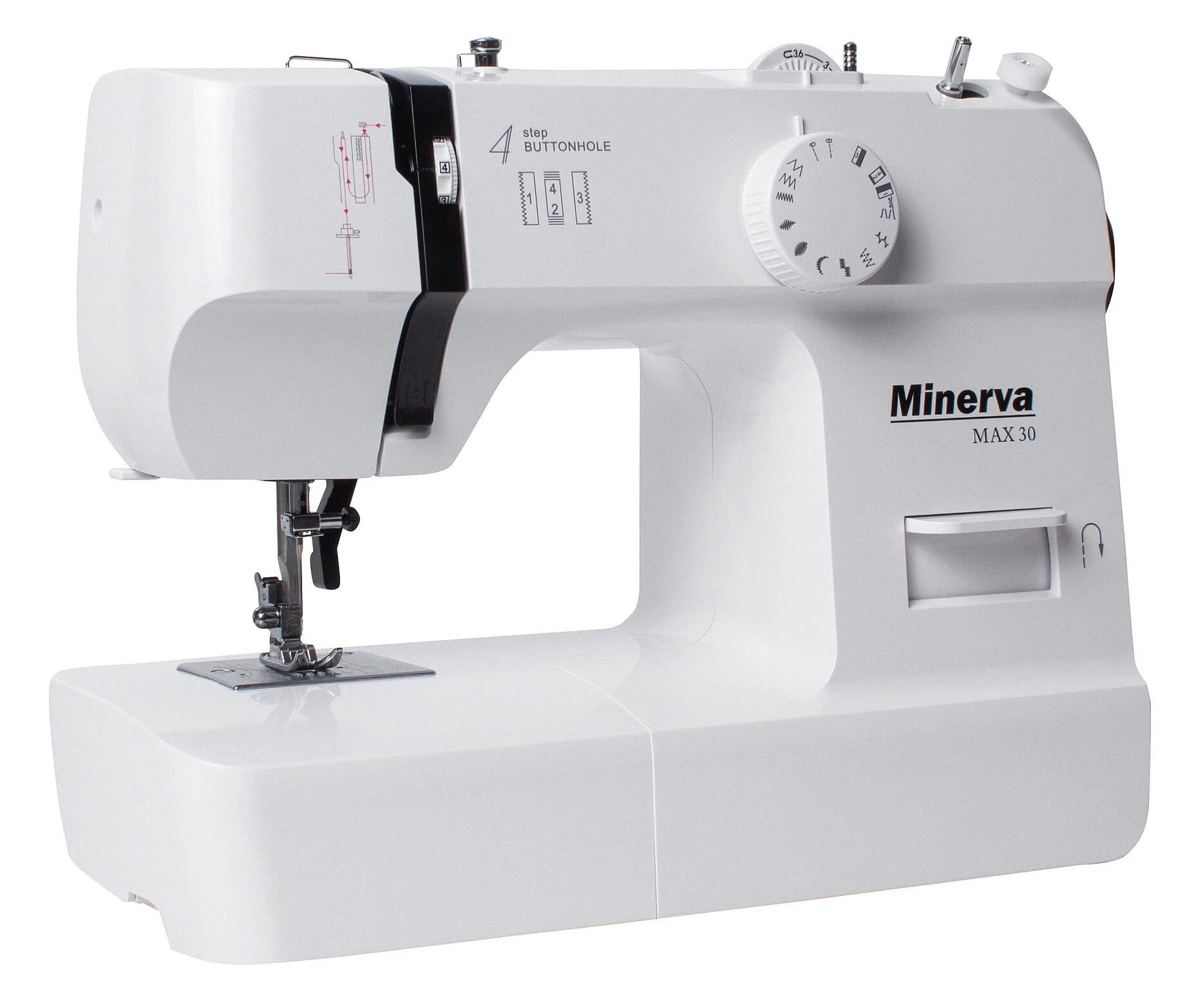 MINERVA Max 30 - нова практична модель швейної машинки компактної серії, оснащена класичним вертикальним човниковим пристроєм і яскравим світлодіодним підсвічуванням. Призначена для шиття і ремонту одягу. Виконує 13 видів строчок. Висока потужність, як для швейних машин компактної серії гарантує високу якість шиття на цупких тканинах.
