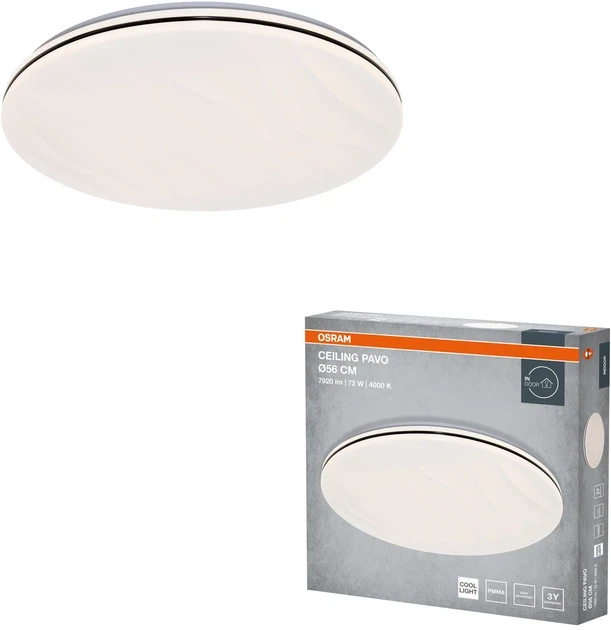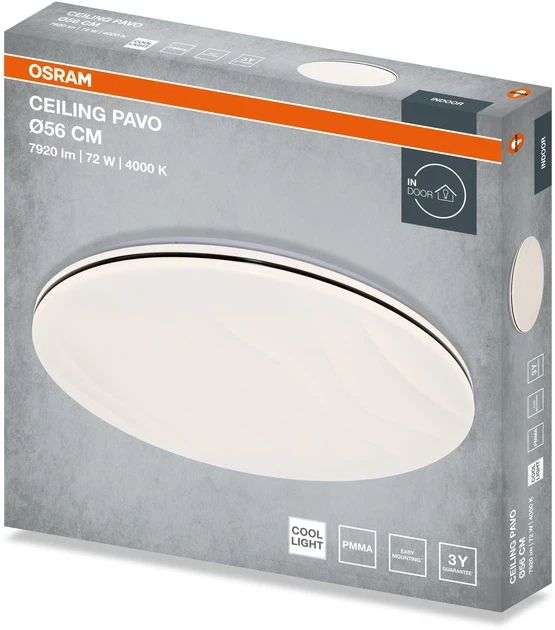 Світильник накладний OSRAM CEILING PAVO 600 мм Round 72Вт 4000K — це потужне та стильне рішення для освітлення великих приміщень. Завдяки високій потужності та широкому куту розсіювання він забезпечує рівномірне освітлення без темних зон. Нейтральне біле світло 4000K створює комфортні умови для роботи та щоденного використання. LED-технологія гарантує стабільну роботу та енергоефективність. Лаконічний круглий дизайн гармонійно доповнює сучасний інтер’єр.