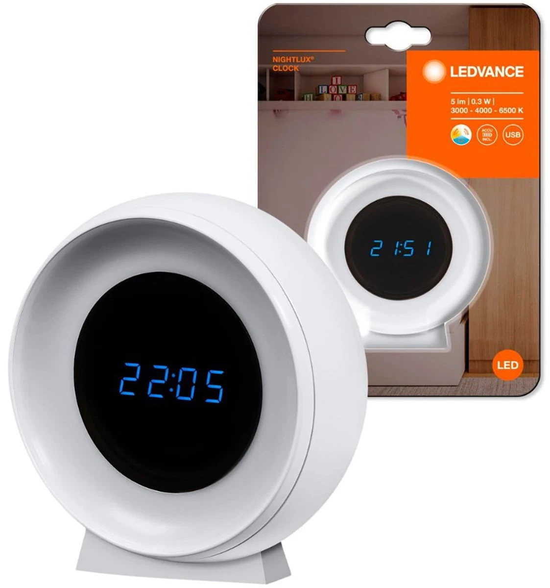 Світильник нічник з акумулятором LEDVANCE NIGHTLUX CLOCK 0.3Вт 3000/4000/6500К 5Лм 1000мА•год годинн