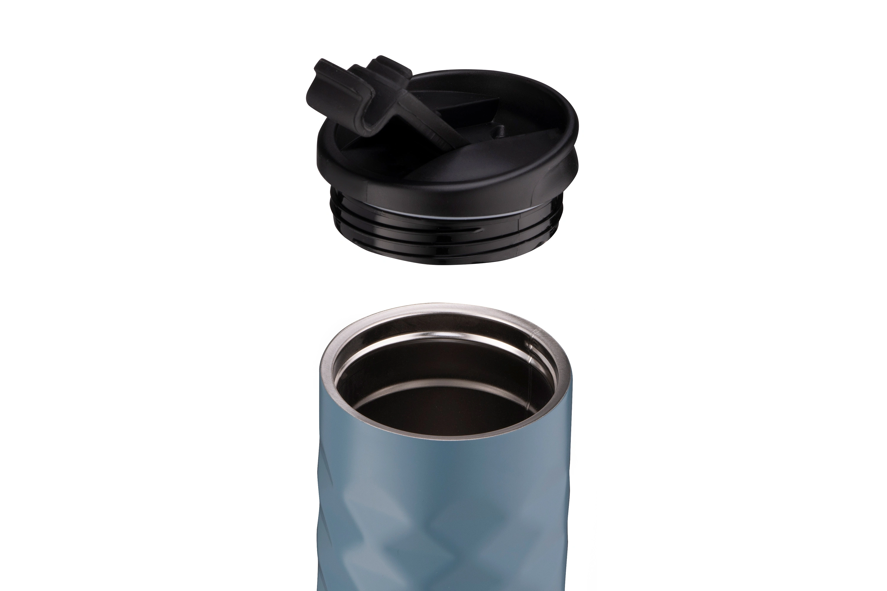 Термокухоль із нержавіючої сталі (18/10) темно-синього кольору заввишки 21,6 см об’ємом 400 мл. Здатний зберігати температуру гарячого напою протягом 6 годин, а холодного – протягом 12 годин. Не можна мити в посудомийній машині.