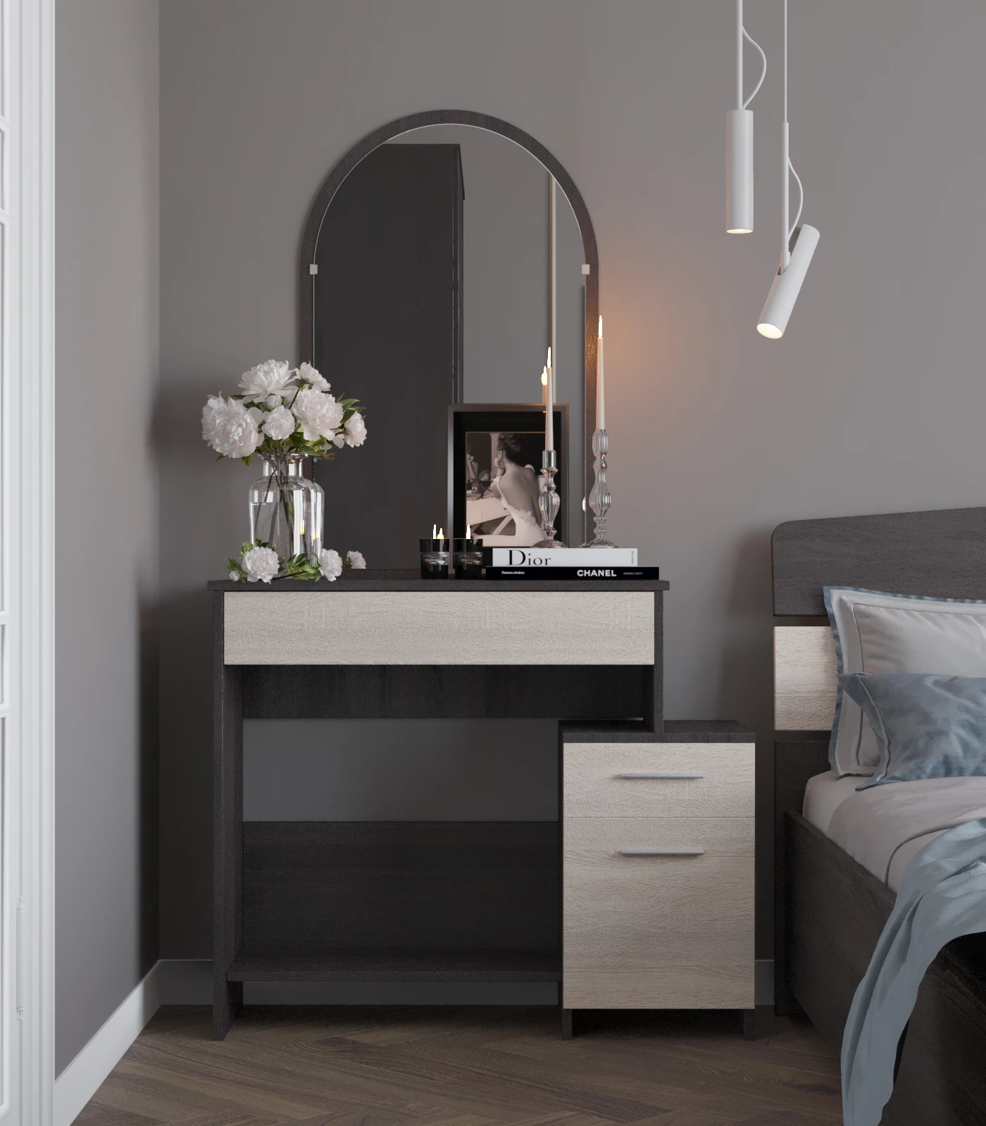 Відкрийте для себе ідеальне поєднання елегантності та практичності з трюмо-1 комплектом для спальні Еверест. Завдяки сучасному дизайну в кольорі венге та дуба молочного, цей комплект не лише доповнить інтер'єр вашої спальні, але й створить затишну атмосферу. Функціональні елементи, такі як місткі ящики та зручна поверхня, забезпечать вам комфорт у щоденному використанні.
