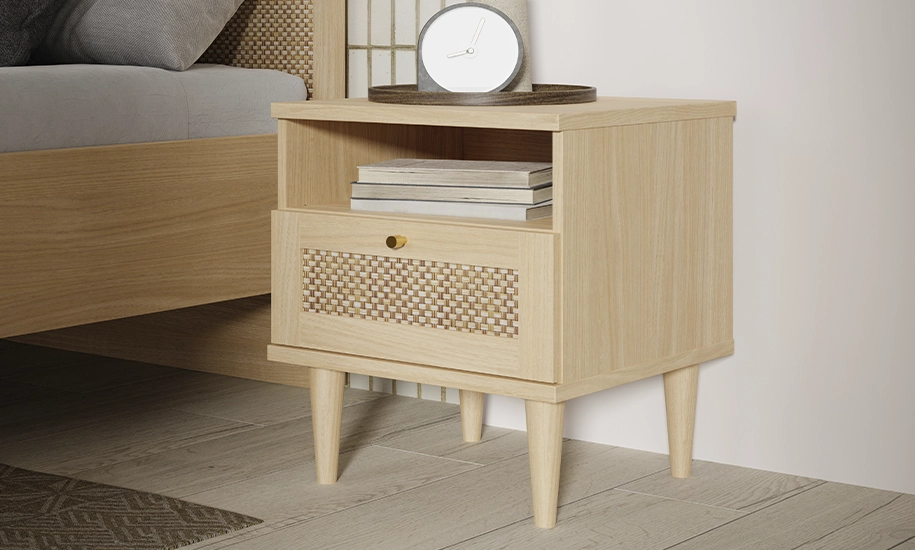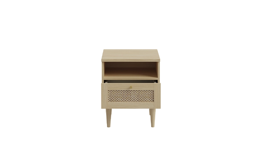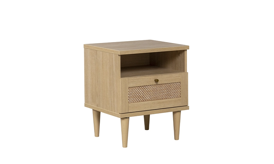 Тумба до ліжка Каласетта — витончений елемент спальні, що поєднує практичність і стиль. Корпус виготовлений із якісної ДСП у кольорі Дуб Елеганс. Фасад виконаний із МДФ, ДСП і ротангу, що додає виробу природної текстури. Металева ручка зручна у використанні, а дерев’яні ніжки забезпечують стійкість і доповнюють загальний образ. Ідеально пасує до ліжка з тієї ж серії, створюючи цілісну атмосферу затишку.