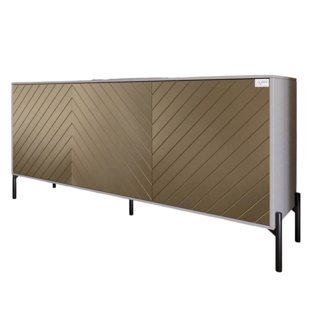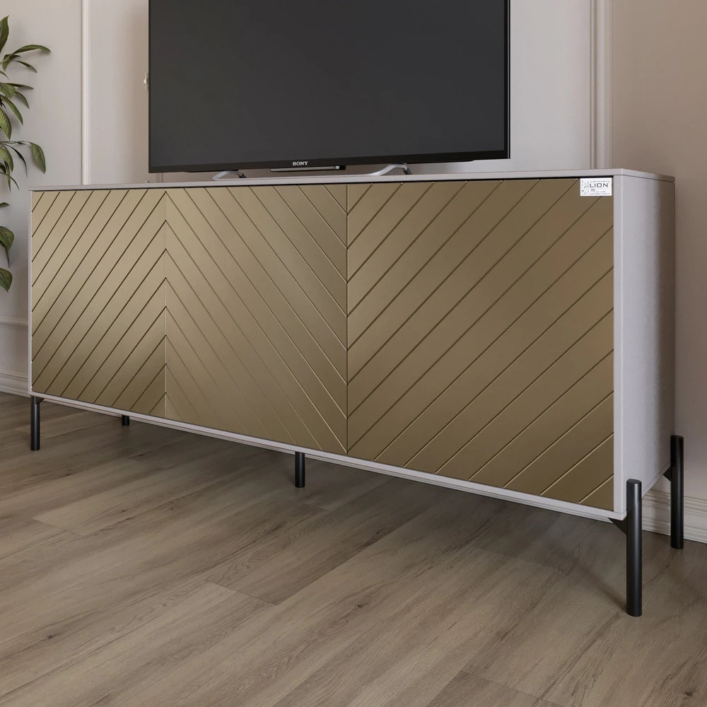 Откройте для себя идеальное решение для вашего интерьера с тумбой под телевизор LION. Этот утонченный мебельный элемент сочетает в себе современный дизайн и практичность, что делает его незаменимым в любой гостиной. Черные металлические ножки придают элегантности, а кашемировый и перламутровый металлик создают впечатление роскоши.