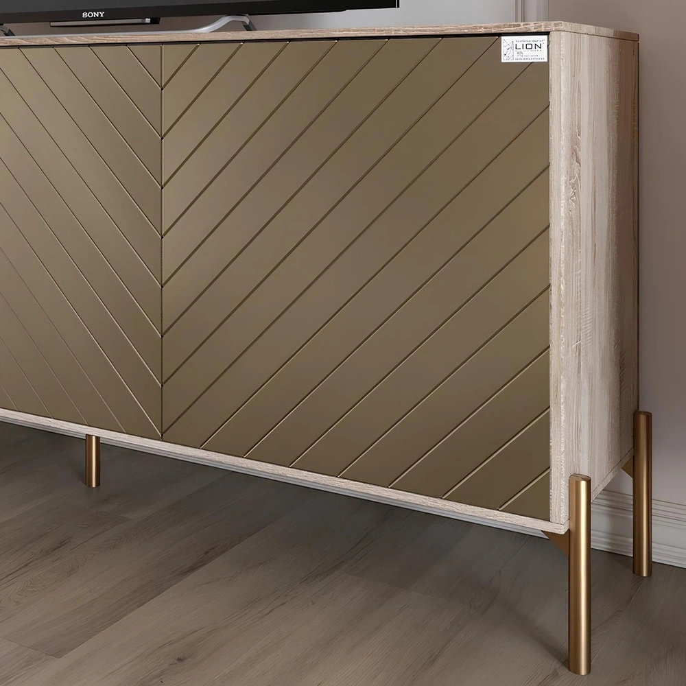 Ваша гостиная заслуживает лучшего! Тумба под телевизор LION с золотыми металлическими ножками станет идеальным упором в любом интерьере. Ее элегантный дизайн в сочетании с цветовой гаммой дуба сонома и перламутрового металлика создаст атмосферу роскоши и уюта. Эта тумба не только эстетически привлекательна, но и чрезвычайно практична. Благодаря размерам 168x40x76,5 см она обеспечивает достаточно места для размещения вашего телевизора и других мультимедийных устройств. Внутренние полочки позволяют организовать пространство, сохраняя порядок в вашей гостиной.