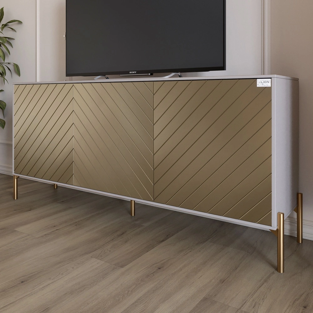 Ищете идеальное сочетание функциональности и эстетики для вашей гостиной? Тумба под телевизор LION станет настоящим украшением вашего дома. Ее изящный дизайн и роскошные золотые металлические ножки добавляют нотку роскоши, подходящую к любому стилю интерьера, от современного до классического. Изготовленная из качественных материалов, эта тумба не только элегантна, но и чрезвычайно практична. Благодаря своим компактным размерам она идеально вписывается в любое пространство, обеспечивая при этом достаточно места для хранения ваших медиаприборов. Вы сможете разместить на ней телевизор и другие аксессуары, не беспокоясь о беспорядке. Она легко сочетается с разными цветовыми палитрами, что позволяет вам экспериментировать с оформлением пространства. Ваша гостиная станет более уютной и привлекательной.