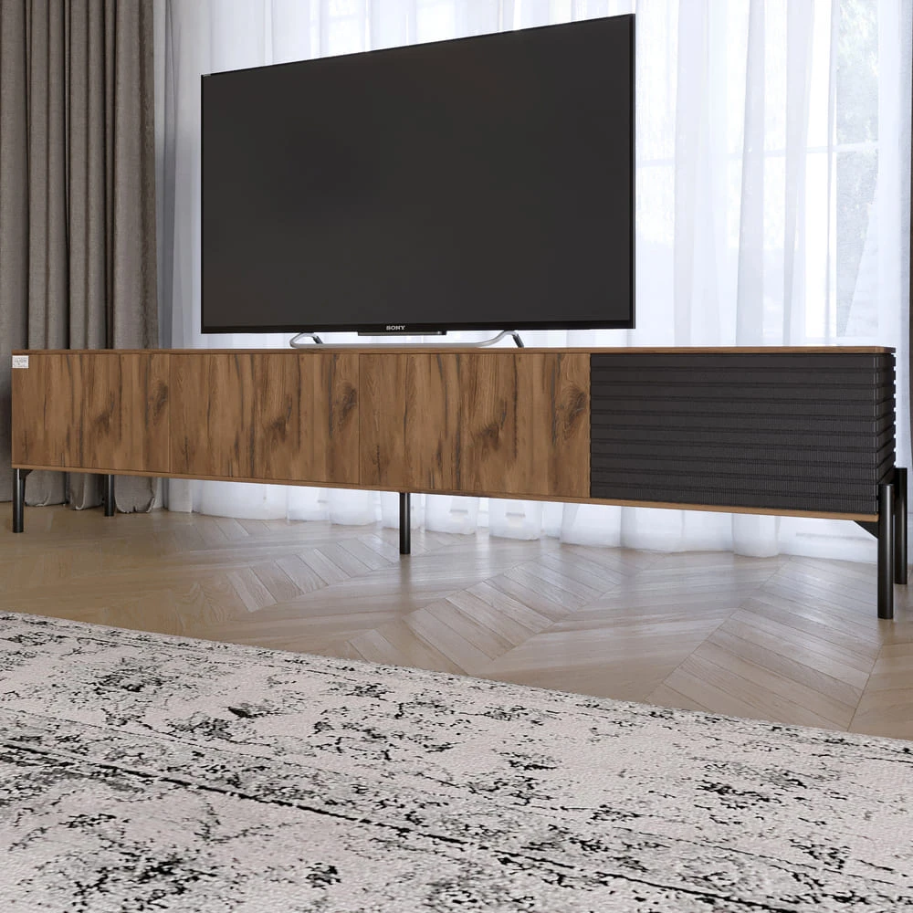 Каждый элемент тумбы продуман до мелочей. Она имеет достаточно места для хранения медиаустройств, пультов и других важных вещей. Это позволит вам сохранять все необходимое под рукой, не нарушая общий эстетический вид.