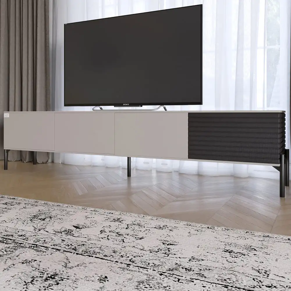 Откройте для себя идеальное решение для вашего интерьера с тумбой под телевизор LION. Изящный мебельный элемент сочетает в себе современный дизайн и практичность, что делает его идеальным дополнением для любой комнаты. Черные металлические ножки придают тумбе стойкость и изящество, а цветовое оформление в Грей Кашемир и Асфальт придает элегантности.