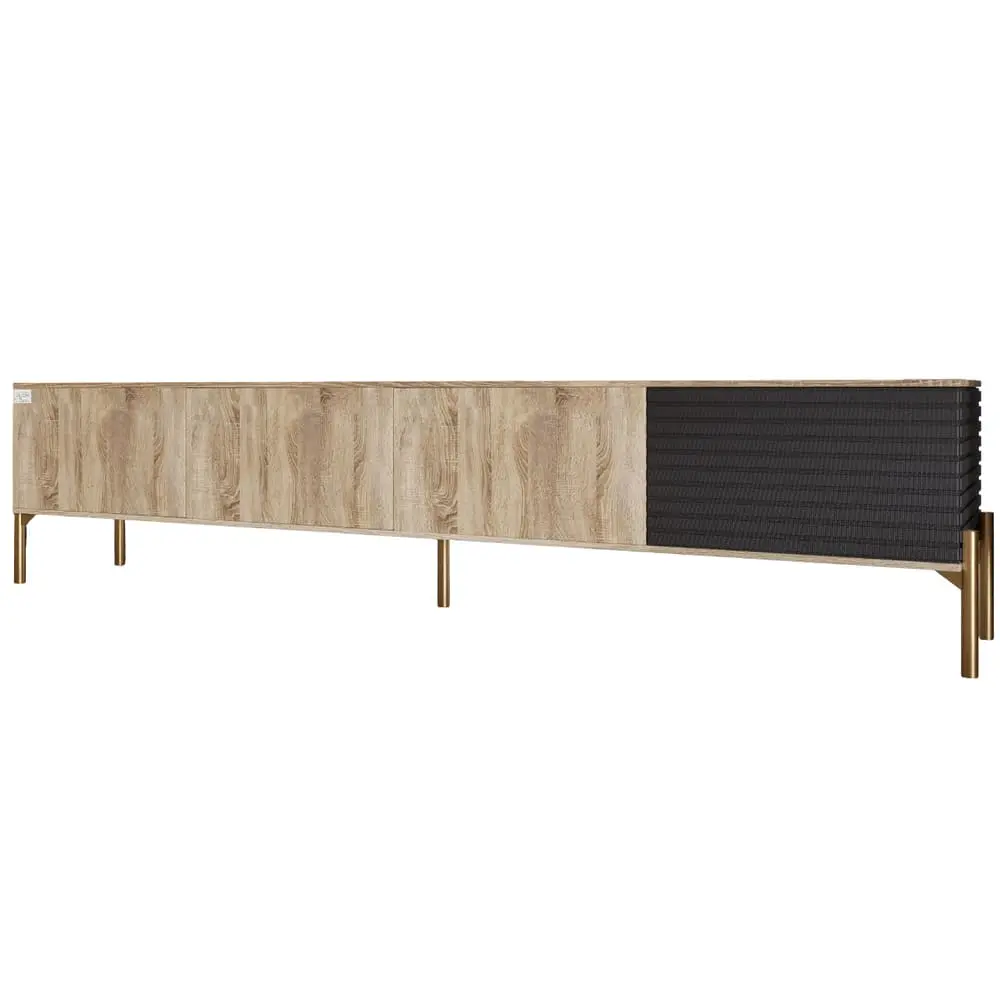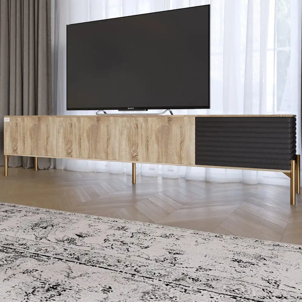 Ваша гостиная заслуживает лучшего! Тумба под телевизор LION станет идеальным дополнением к вашему пространству, сочетая функциональность и современный дизайн. Золотые металлические ножки придают ей изысканный вид, а цветное сочетание Грей Дуб Сонома и Асфальт придает нотки роскоши и элегантности. Благодаря продуманной конструкции, эта тумба не только подходит для размещения телевизора, но и предлагает достаточно простора для хранения аксессуаров, техники и других вещей. Вы сможете с легкостью организовать свое пространство, сохраняя порядок и стиль.