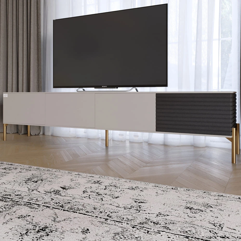 Откройте для себя идеальное сочетание современного дизайна и функциональности с тумбой под телевизор LION. Этот утонченный мебельный элемент станет настоящим украшением вашего интерьера, придавая ему неповторимый стиль. Золотые металлические ножки придают нотку роскоши, а стильный цвет Грей Кашемир с Асфальтом подходит к любому современному интерьеру.