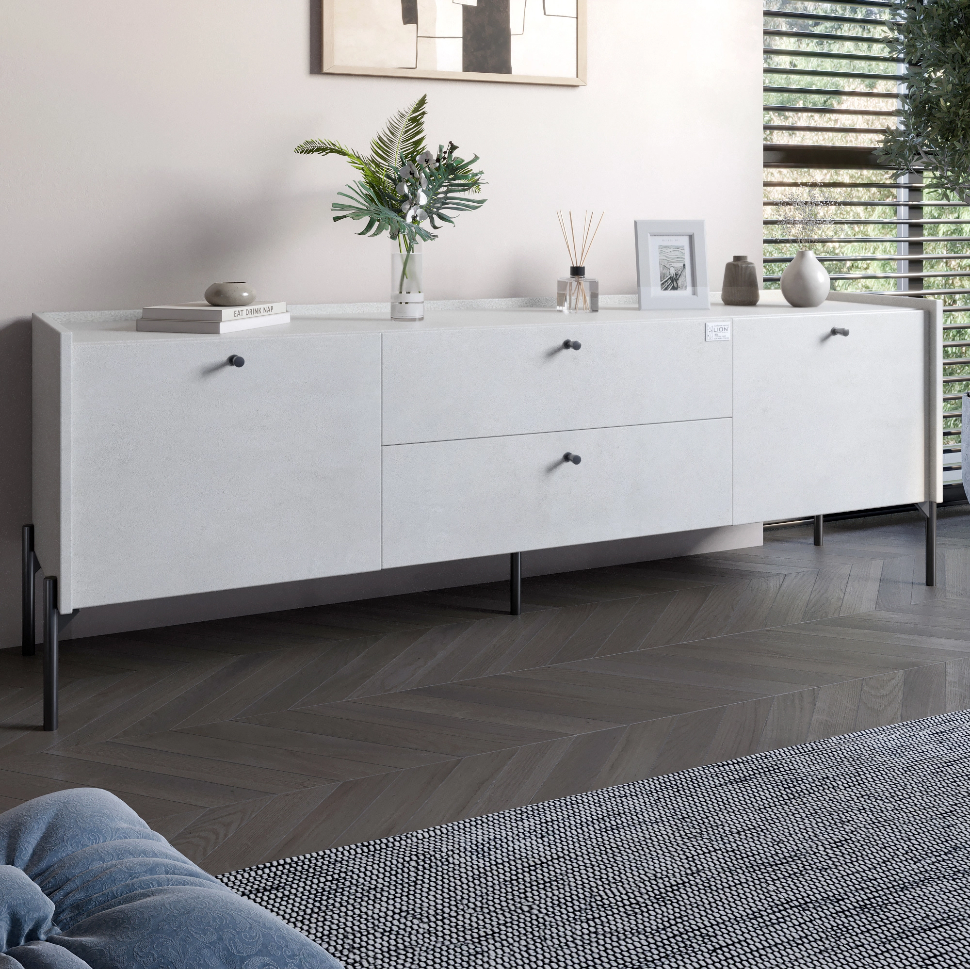 Тумба під телевізор з шухлядами LION Wood з чорними ніжками 180х50х40 см Бетон style (LION-043123)