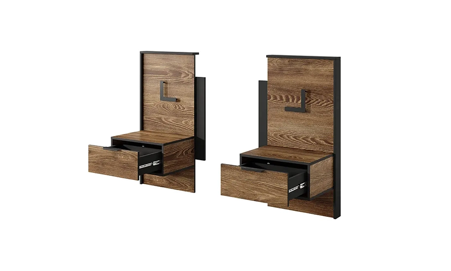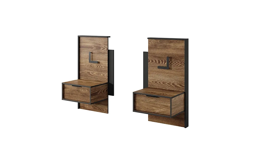 Комплект включає дві тумби та декоративні панелі, що створюють цілісний інтер'єр і підкреслюють акцентну зону біля ліжка.