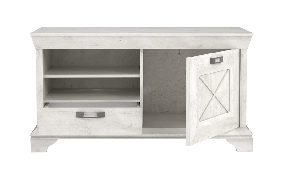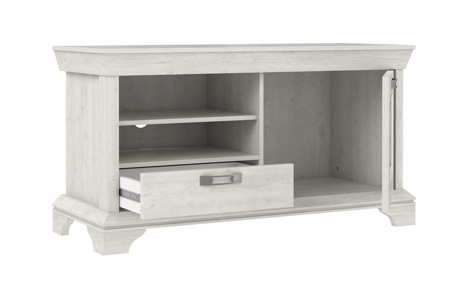 Тумба РТВ 1д1ш Kashmir KSMT22 вирізняється світлим відтінком білої пінії, що створює відчуття легкості й затишку в інтер’єрі. Лаконічний дизайн у стилі прованс робить модель доречною як у класичних, так і в сучасних мінімалістичних просторах.