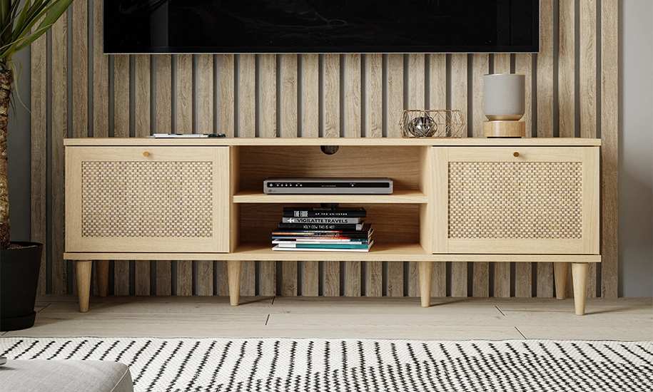 Тумба РТВ Каласетта — стильне й функціональне рішення для вашої вітальні. Корпус виконаний із міцної ДСП у кольорі Дуб Елеганс, фасади — з поєднання МДФ, ДСП і ротангу, що створює теплий природний акцент. Дві дверки з металевими ручками приховують просторе внутрішнє зберігання. Дерев’яні ніжки додають легкості та гармонійно завершують образ. Ідеальна для розміщення телевізора та зберігання медіааксесуарів.