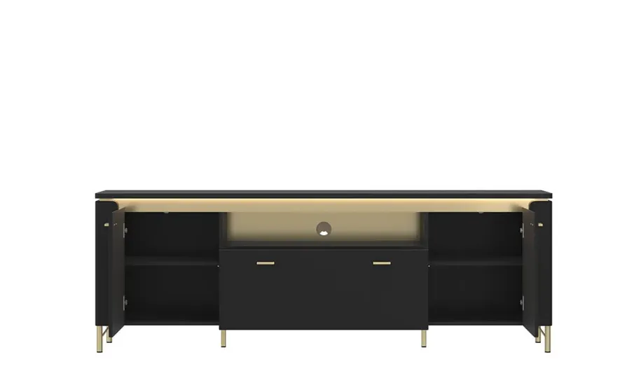 Тумба виготовлена з ламінованого ДСП та МДФ у матовому чорному кольорі з золотими елементами. Оснащена безшумними завісами, кульковими направляючими для шухляд та відкритою полицею для апаратури. Структурне освітлення TREND LED додає сучасного вигляду.