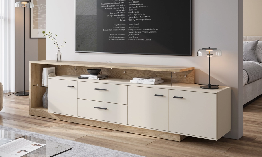 Конструкція включає три закриті відділення, дві висувні шухляди на телескопічних направляючих та відкрите відділення зі скляною полицею. Такий поділ забезпечує зручне зберігання техніки, аксесуарів і дрібних речей.