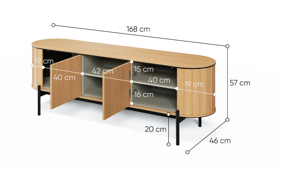 - Ширина 168 см - оптимальний формат для розміщення телевізора, саундбару, ігрової консолі або декору. Завдяки невеликій висоті екран залишається у зручному для перегляду положенні.