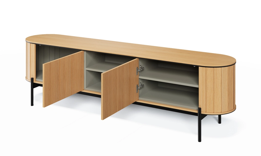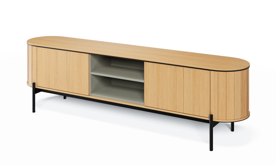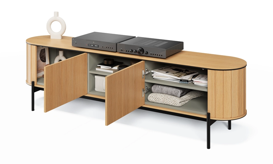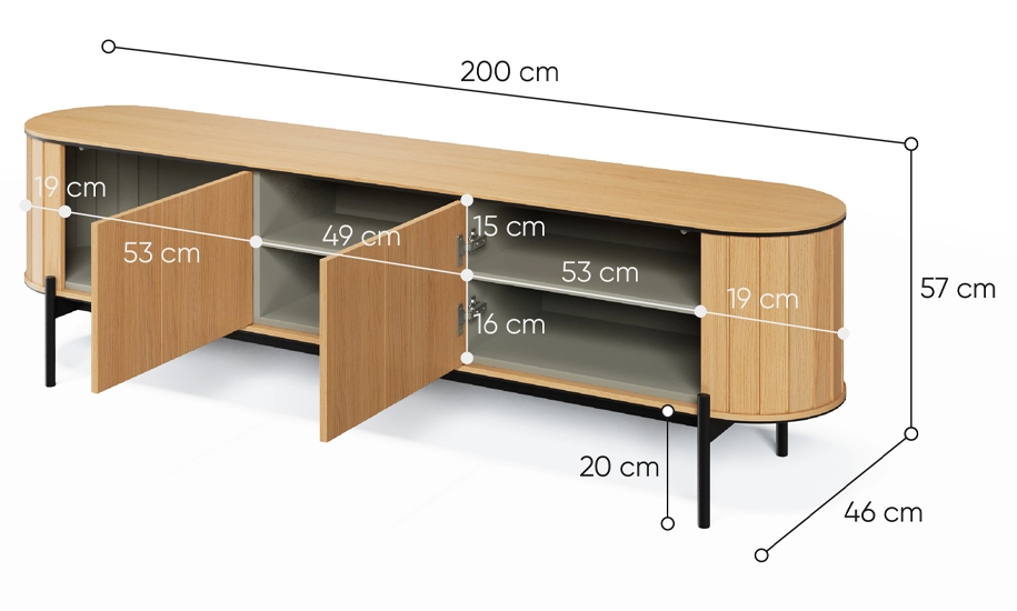 - Ширина 200 см - це можливість організувати не лише технічну зону для телевізора, а й додаткове місце для зберігання всього важливого: пультів, кабелів, консолей, книг чи декору.