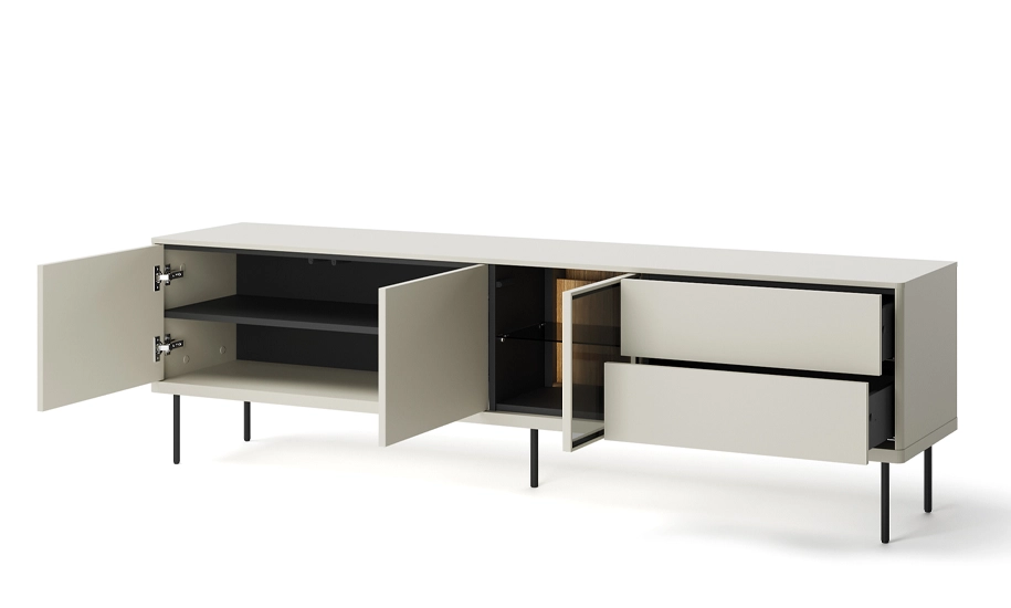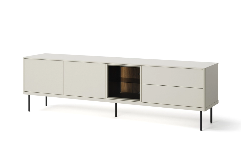 - Тумба має дві дверцята, дві шухляди та одну засклену вітрину, що дозволяє поєднати відкриті й закриті зони зберігання. Це зручно для організації кабелів, пультів, ігор, журналів та інших аксесуарів, які хочеться мати під рукою, але не на видноті.