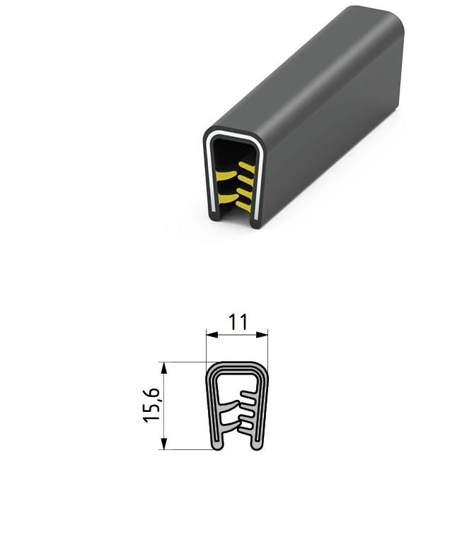 Ущільнювач «Essentra – Mesan» №340.09.540, розміри: висота 15,6мм, ширина 11 мм. Матеріали, що використовуються: сталь, полівінілхлорид. Колір: чорний (всередині жовтий) ( колір від 100000м). Температурні режими: від -20 до 120. Цей ущільнювач застосовується на виробах товщиною металу до 4,5мм і має ребристу поверхню всередині. На замовлення можна змінити температурний режим.
