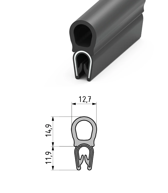Ущільнювач "Essentra - Mesan" №340.09.805, розміри: висота 27мм, ширина 12,7мм, притиск 12мм. Використовувані матеріали: сталь, полівінілхлорид, каучук (етилен-пропілен-дієн-терполімер). Колір: чорний (ваш колір 100000м). Температурні режими: від -20 до 120. Цей ущільнювач застосовується на виробах товщиною металу до 4мм і має ребристу поверхню всередині. На замовлення можна змінити температурний режим.