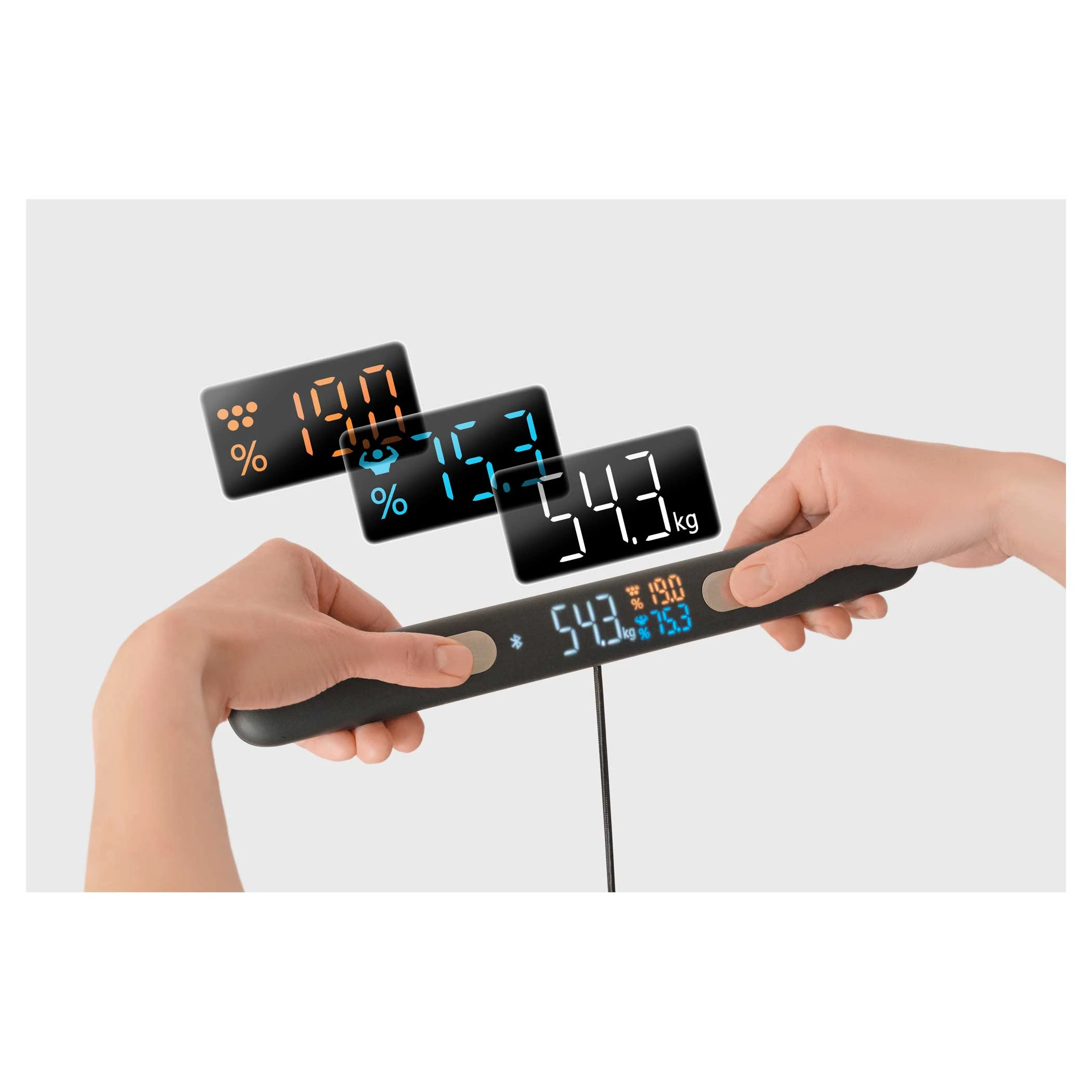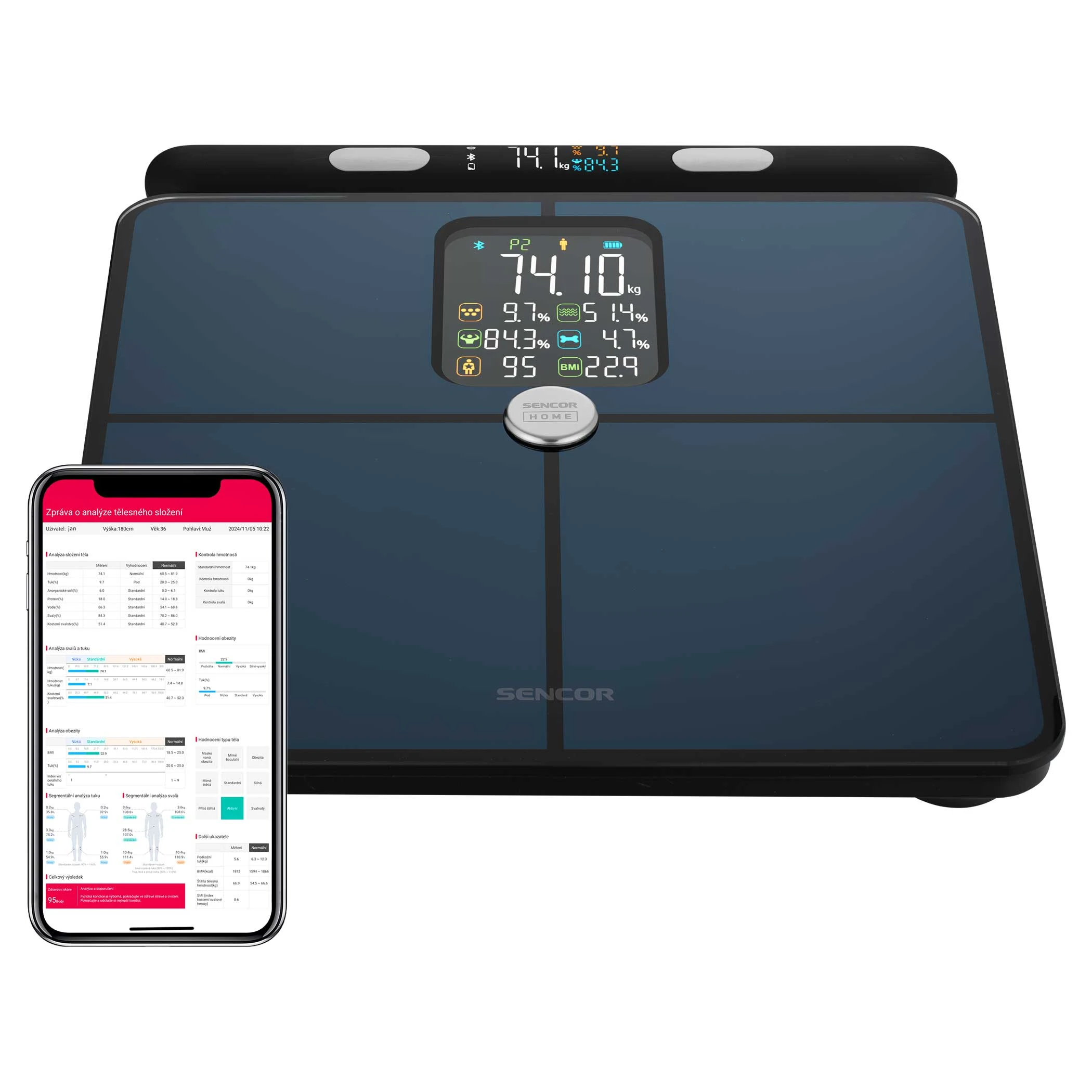 Підлогові розумні ваги Sencor з точним 5-сегментним аналізом тіла, Bluetooth-з'єднанням і підтримкою Sencor HOME. Показують ІМТ, жир, воду, м'язову й кісткову масу, дають поради щодо калорій. Сумісні з Apple Health, Google Fit, Fitbit. Загартоване скло, підсвічування дисплея, живлення 4×AAA.