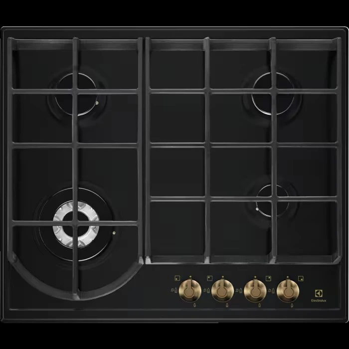 Газова варильна поверхня Electrolux Rococo шириною 60 см поєднує матове чорне оформлення та чавунні тримачі посуду. Конфорка Multicrown WOK забезпечує інтенсивний нагрів для страв азійської кухні. Інтегроване електрозапалювання активується поворотом регулятора. Система газ-контролю припиняє подавання газу за відсутності полум’я. Модель виготовлена в стилістиці ретро з рустикальними ручками.