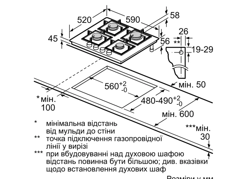 Мін. необхідні розміри ніші для вбудовування (ВхШхГ): 45 x 560-560 x 480-490 мм