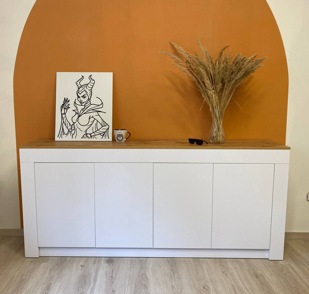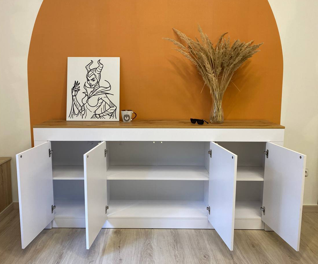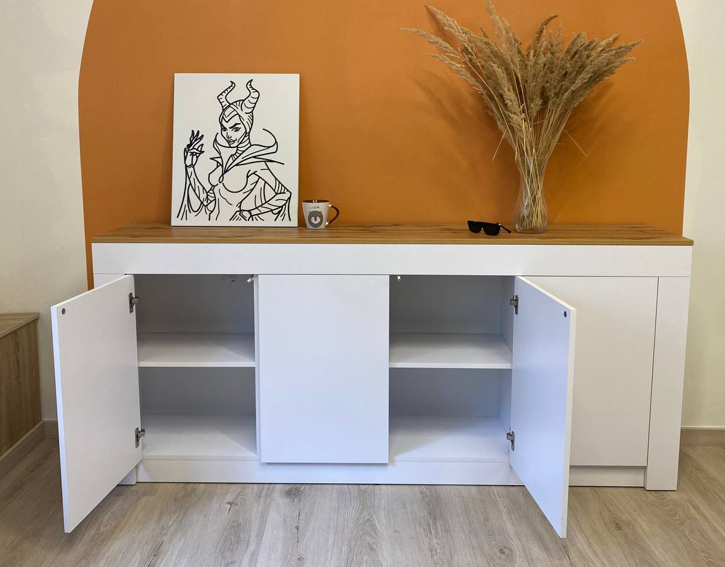 Комод изготовлен из высококачественной ламинированной ДСП от производителя Swiss Krono, что гарантирует износостойкость и длительный срок службы. Конструкция на царгах обеспечивает устойчивость, а четыре дверцы позволяют удобно зонировать внутреннее пространство для хранения разных вещей.