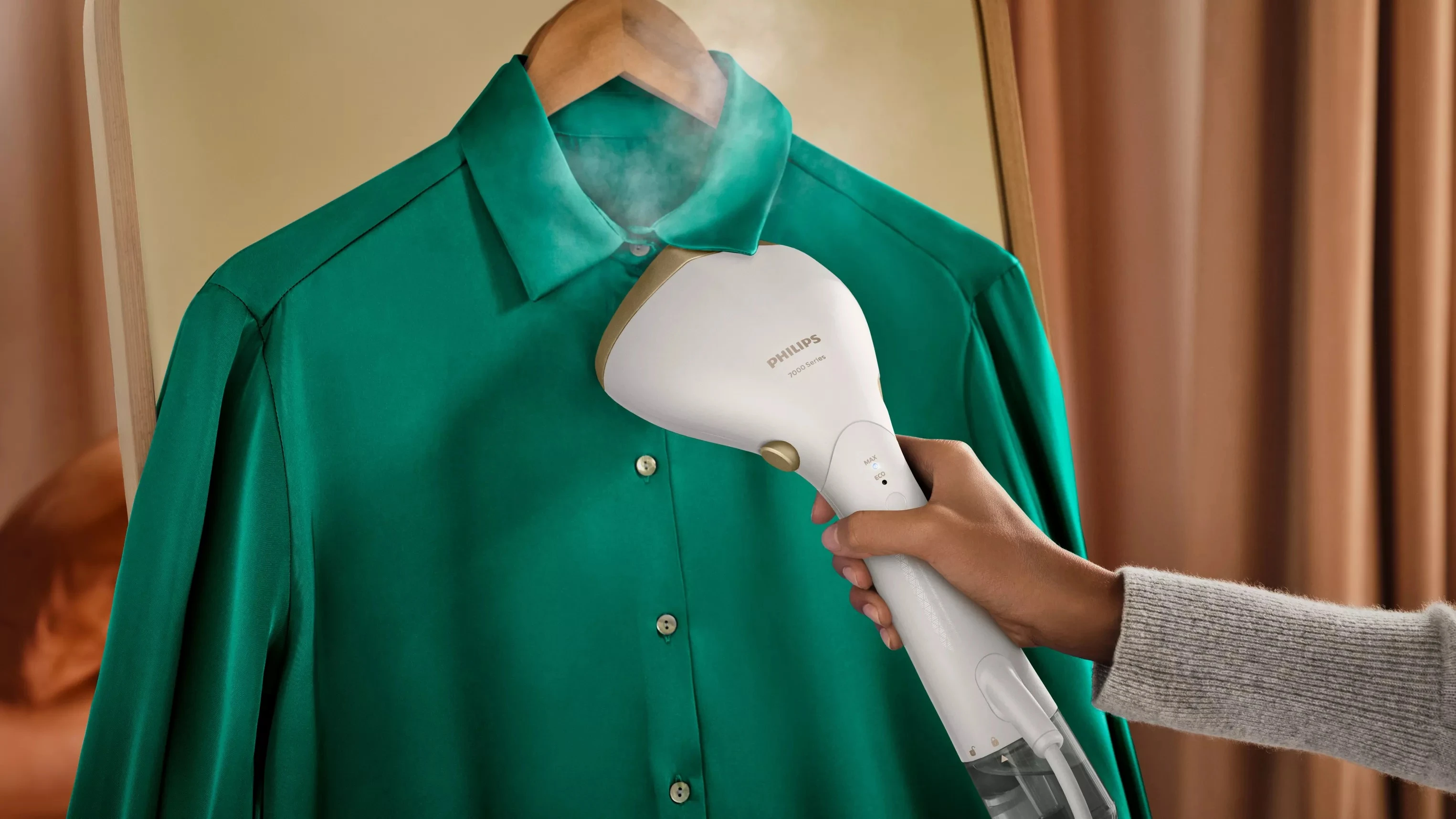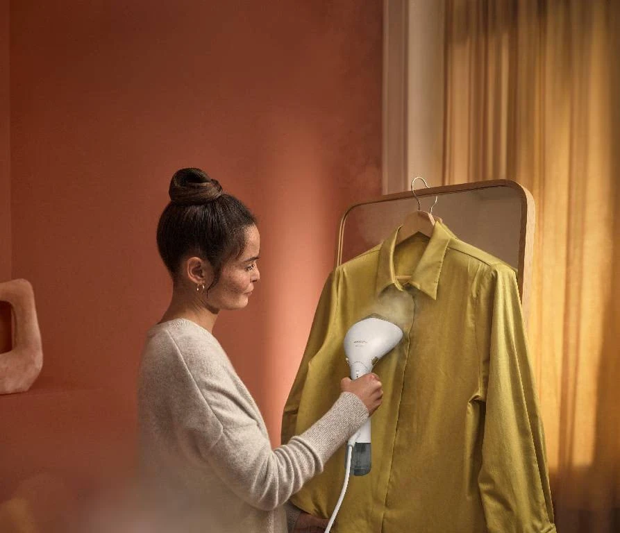 За допомогою ручного парового прасувального пристрою Philips серії 7000 ви зможете миттєво підготувати до носіння все, що у вас є. Його регульована головка та загострений наконечник парової пластини швидко та зручно розгладжують складки під будь-яким кутом, а функція OptimalTemp гарантує відсутність опіків.